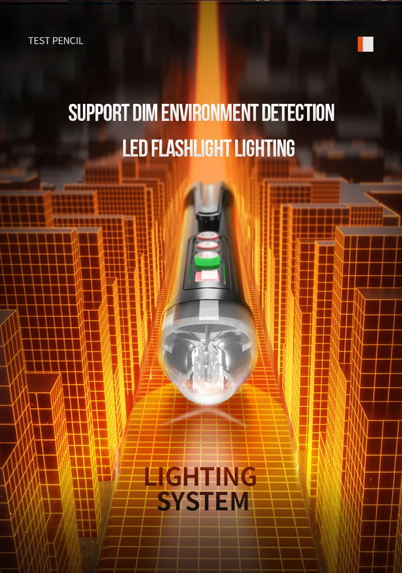 1. Нажмите кнопку питания, чтобы начать тестер. 2. Оповещение о напряжении: Если напряжение переменного тока обнаружено, звуковой сигнал и светодиодный свет будет мигать. Чем выше напряжение переменного тока, тем выше частота звуковых сигналов и вспышек. 3. Фонарик: встроенный свет полезен в тусклых условиях и автоматически выключается через 5 минут для экономии энергии. 4. Автоматическое выключение: тестер напряжения автоматически выключится через 3 минуты без обнаружения напряжения переменного тока. 5. Индикатор низкого заряда батареи: Когда батарея низкая, индикатор питания мигает 3 раза, зуммер будет звуковой сигнал один раз, и ручка тестера выключится.