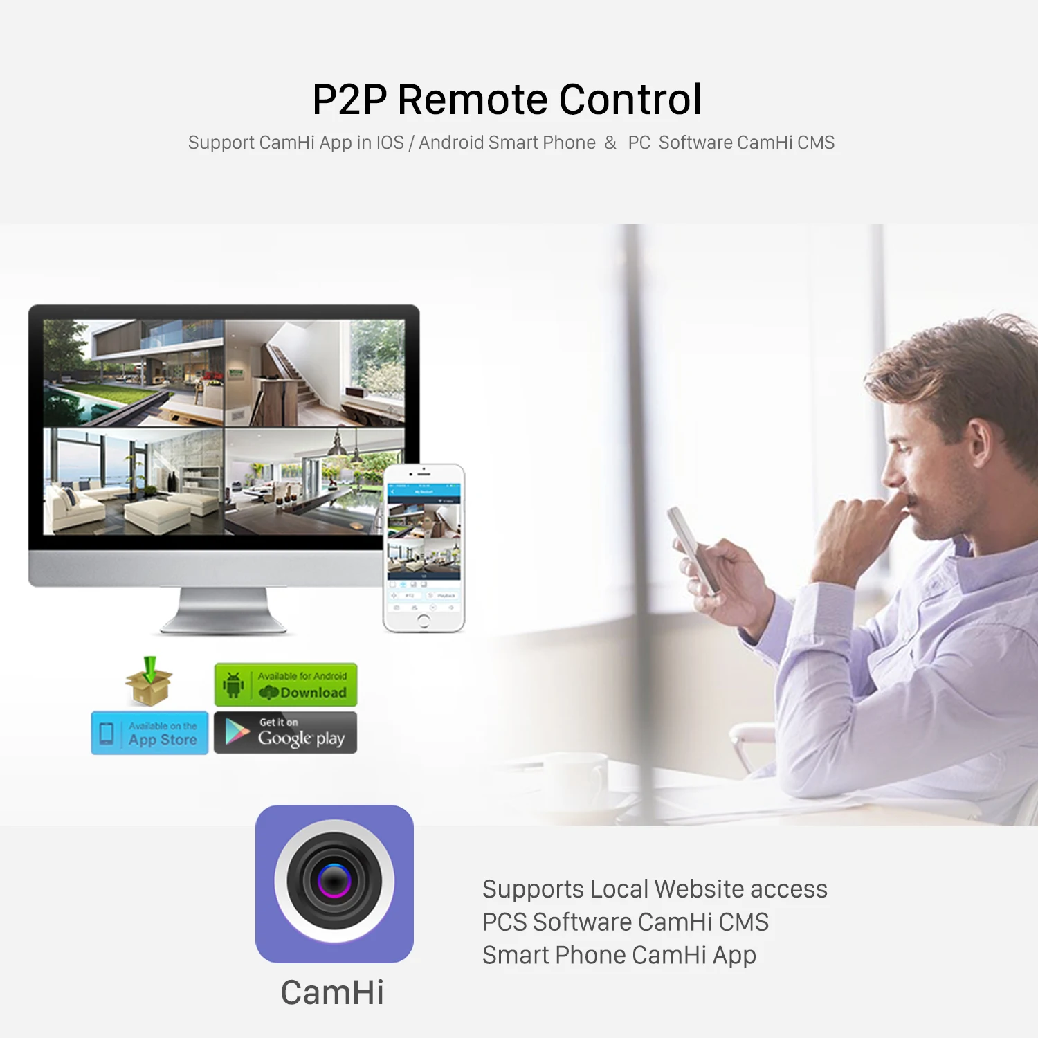 Поддержка удаленного просмотра в приложении CamHi на мобильный телефон, просмотр веб-интерфейса, клиент HiP2P на ПК.