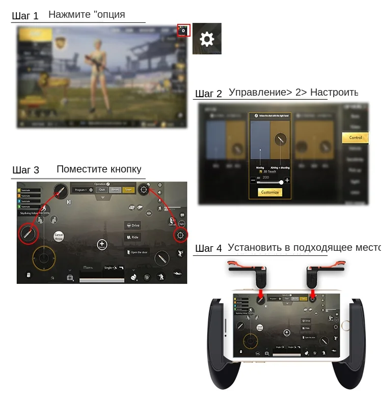 Шаг 1: Установите триггеры на телефон. Затем нажмите «Настройка» в меню. Шаг 2: нажмите «operation setting» и откройте «пользовательскую панель» Шаг 3: переместите «стрельба» и «цель» в правильное положение. Шаг 4: Istall геймпад к телефону. Шаг 5: прежде чем играть в игры, заблокируйте экран телефона на 3 секунды, затем разблокируйте экран телефона, чтобы активировать триггер. Шаг 6: Войдите в тест simulation battlefield.