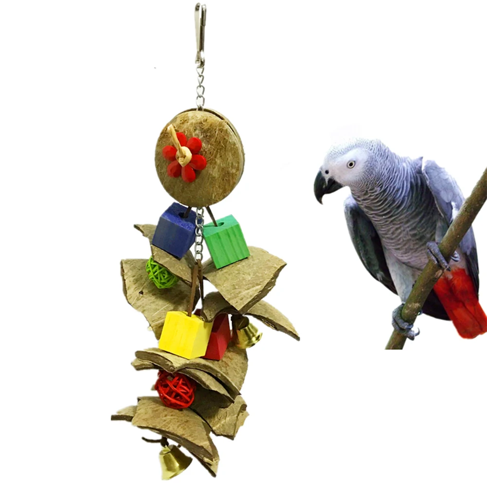 Натуральный кокос оболочки кусая струна: оснащен колокольчиками, и цвет красивый. Это соответствует предпочтению птицы. Он может повесить декоративные клетки для птиц, может быть немного и влезает, укрепляет баланс птицы и навыки для сотрудничества, а также помогает тренироваться.