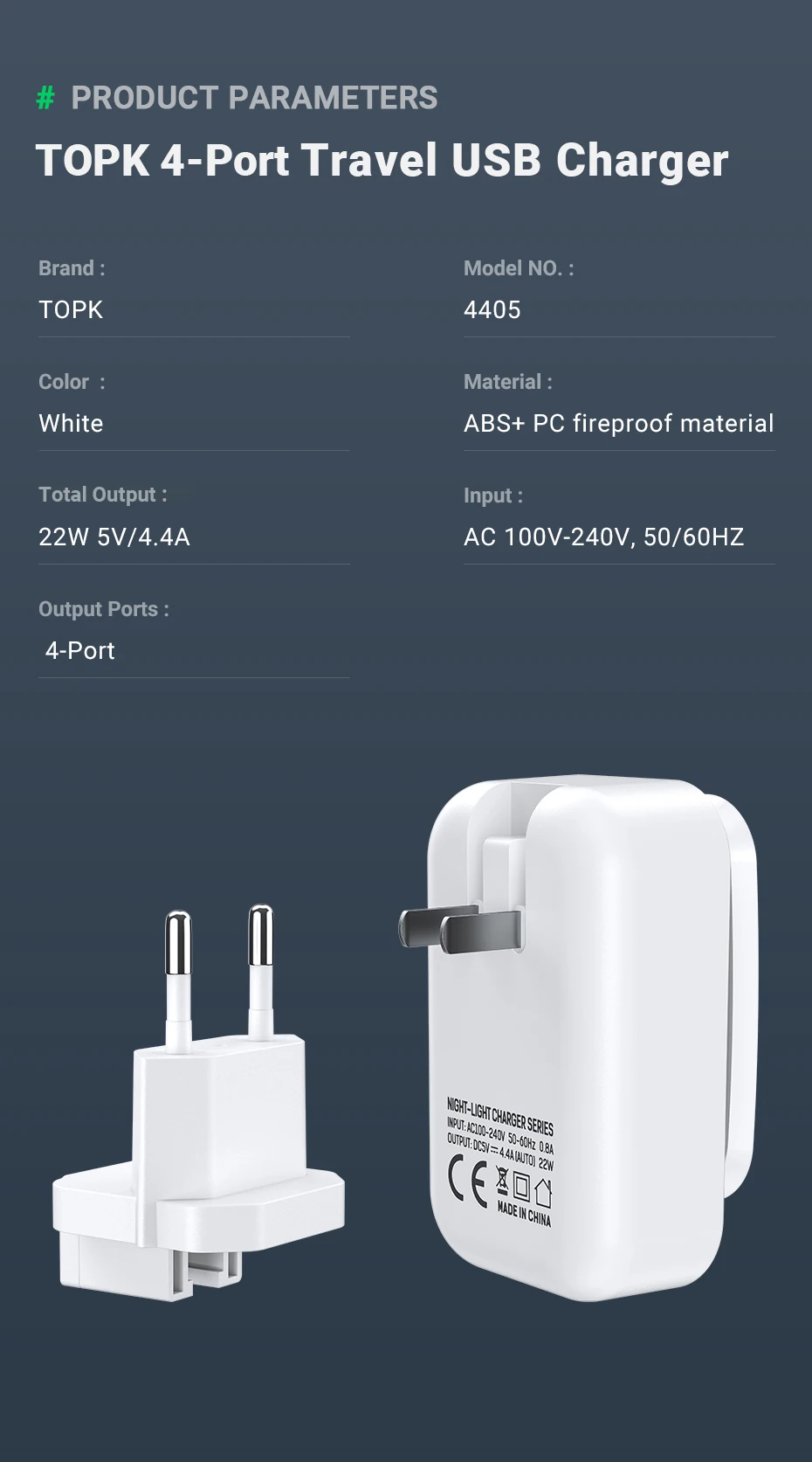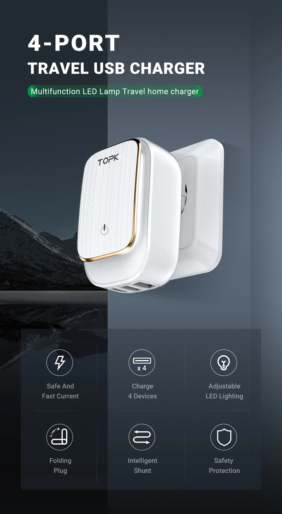 Продукт Особенности -Светодиодный Ночной светильник дизайн: Для мамы с ребенком, можно легко прикоснуться к бесшумному выключателю, чтобы контролировать Ночной светильник и регулировать яркость через Длительное нажатие, еще более удивительным является то, что он может запомнить ваши настройки, чтобы обеспечить лучший сон вашего ребенка -4-Порты и разъёмы Auto ID Технология: 4-Порты и разъёмы Максимальная выходная мощность 22W/4.4A питания, и он имеет высокую эффективность зарядки и он может автоматически идентифицировать ваше устройство, чтобы гарантировать, что выходная мощность и устройства в комплекте, так что вы не беспокоитесь о сильном токе может привести к потенциальным опасностям безопасности -2-в-1 дорожный Зарядное устройство: Вам нравится путешествовать? Портативное зарядное устройство TOPK имеет штепсельную вилку EU & US, выход AC 100V ~ 240V подходит для большинства стран по всему миру, поэтому путешествуйте с ним, вы можете удобно и сэкономить -Безопасность Гарантия: Зарядное устройство TOPK имеет систему защиты от перезарядки, перегрева и перегрева. Которая может максимально защитить вашу семью и устройства