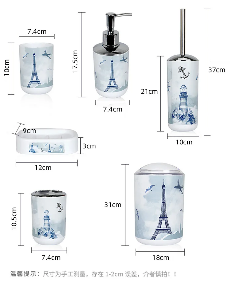 -Неваляшка: на высоком каблуке 13 см * 6,5 см в диаметреЗубная щётка чашки: 13,5 см * 6,5 см в диаметреДозатор для жидкого мыла: 15 см * 6,5 см в диаметреМыльница: высота 12 см * ширина 9 смЕршик для унитаза: 38 см * 7,5 см в диаметреМусорное ведро: 30 см Высота * 19 см Диаметр