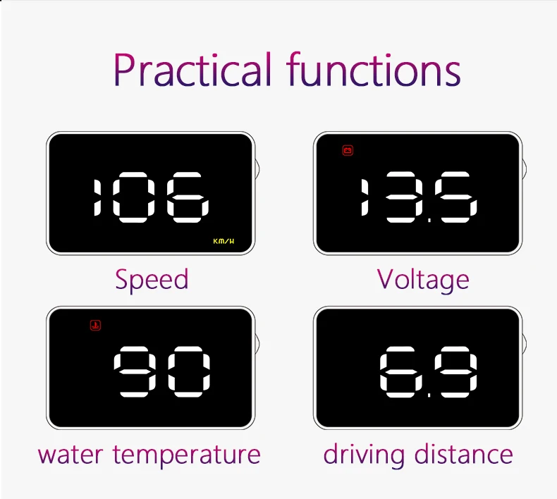 Особенности:1. Автоматически адаптируется к моделям автомобилей, соответствует OBDII или EUOBD (Автомобильная диагностическая система) автомобилей; Подключи и работай;2. 3,5 дюймов большой экран HD дисплей;3. Многоцветный дизайн экрана для более удобного чтения;4. Использование нанотехнологий для устранения избыточных отражений, делает изображение более четким;5. Дисплей: скорость автомобиля, об/мин, температура воды, напряжение, односекционное измерение пройденного Расстояния, оповещение о смене, напоминание о усталости вождения, Сигнализация низкого напряжения, сигнализация с высокой температурой воды, сигнализация с превышением скорости, сигнализация неисправности двигателя, устранение кода неисправности; Переключатель км/миль;6. Автоматическое включение/выключение при запуске/остановке автомобиля, эффективно защищает автомобильную батарею; Также с ручным режимом переключения;7. Автоматический и ручной режим регулировки яркости, не ослепляющий вождение;