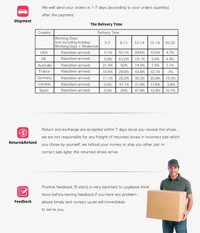 1. Наш размер не является стандартным размером США, и он равен только длине стопы! 2. Стандарты размеров разных стран или разных производителей отличаются, длина вашей стопы является единственным критерием для выбора размера. Мы настоятельно рекомендуем: в соответствии с нашей таблицей размеров выбрать наиболее подходящий размер!Это очень важно!