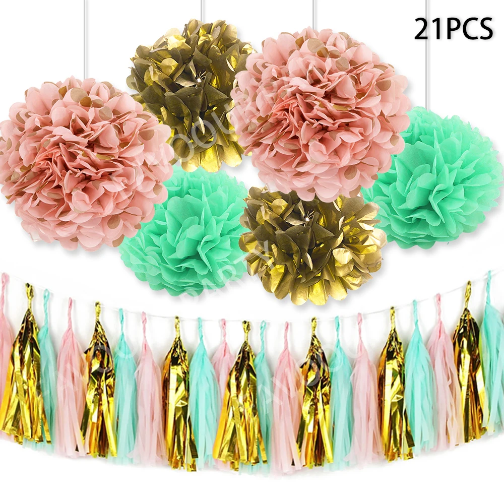 Стиль:Мятно-зеленые бумажные цветы, розовая Золотая гирлянда в горошек с кисточками