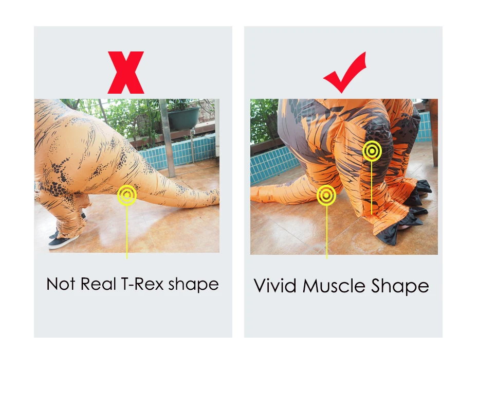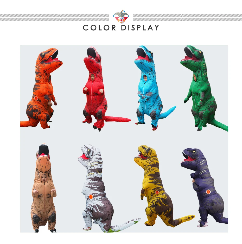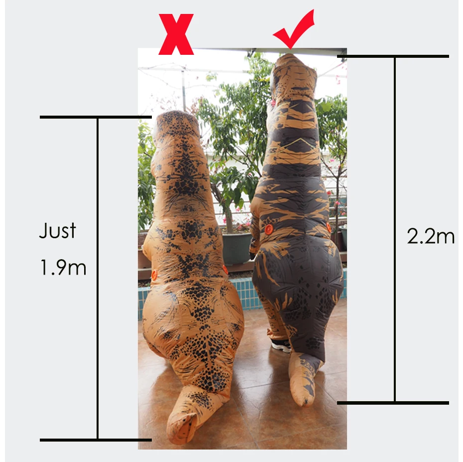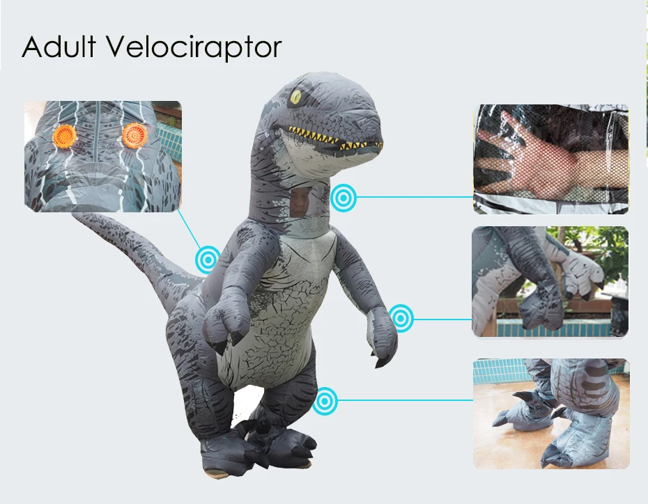 Для взрослых T-Rex 2,2 м, костюм 1,5-2 м для взрослых; Дети T-Rex в парк развлечений 1,8 м, костюм 0,9-1,3 м; Подходит для детей от взрослых в натуральную величину Велоцираптор 2,3 м, костюм 1,5-2 м для взрослых; Двойные вентиляторы для взрослых T-Rex включают в себя 1 костюм, 2 перчатки, 2 вентилятора, 2 батарейных отсека, 2 usb-кабеля, 1 сумку; Для взрослых, один вентилятор T-Rex включает 1 костюм, 2 перчатки, 1 вентилятор, 1 батарейный блок, 1 usb-кабель, 1 сумка; Дети T-Rex включают 1 костюм, 2 перчатки, 1 вентилятор, 1 батарейный блок, 1 USB кабель, 1 сумка; Велоцираптор для взрослых включает 1 костюм, 2 перчатки, 2 вентилятора, 2 батарейных отсека, 2 usb-кабеля, 1 сумку