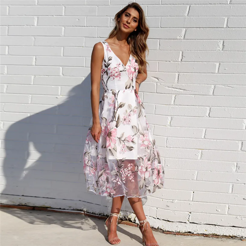 Женское летнее платье макси с v-образным вырезом и цветочным принтом