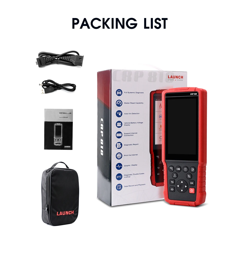 1. handset CRP808 2. Диагностический кабель OBD II 3. Зарядный кабель 5 в постоянного тока 4. Руководство пользователя 5. Мягкий чехол для переноски