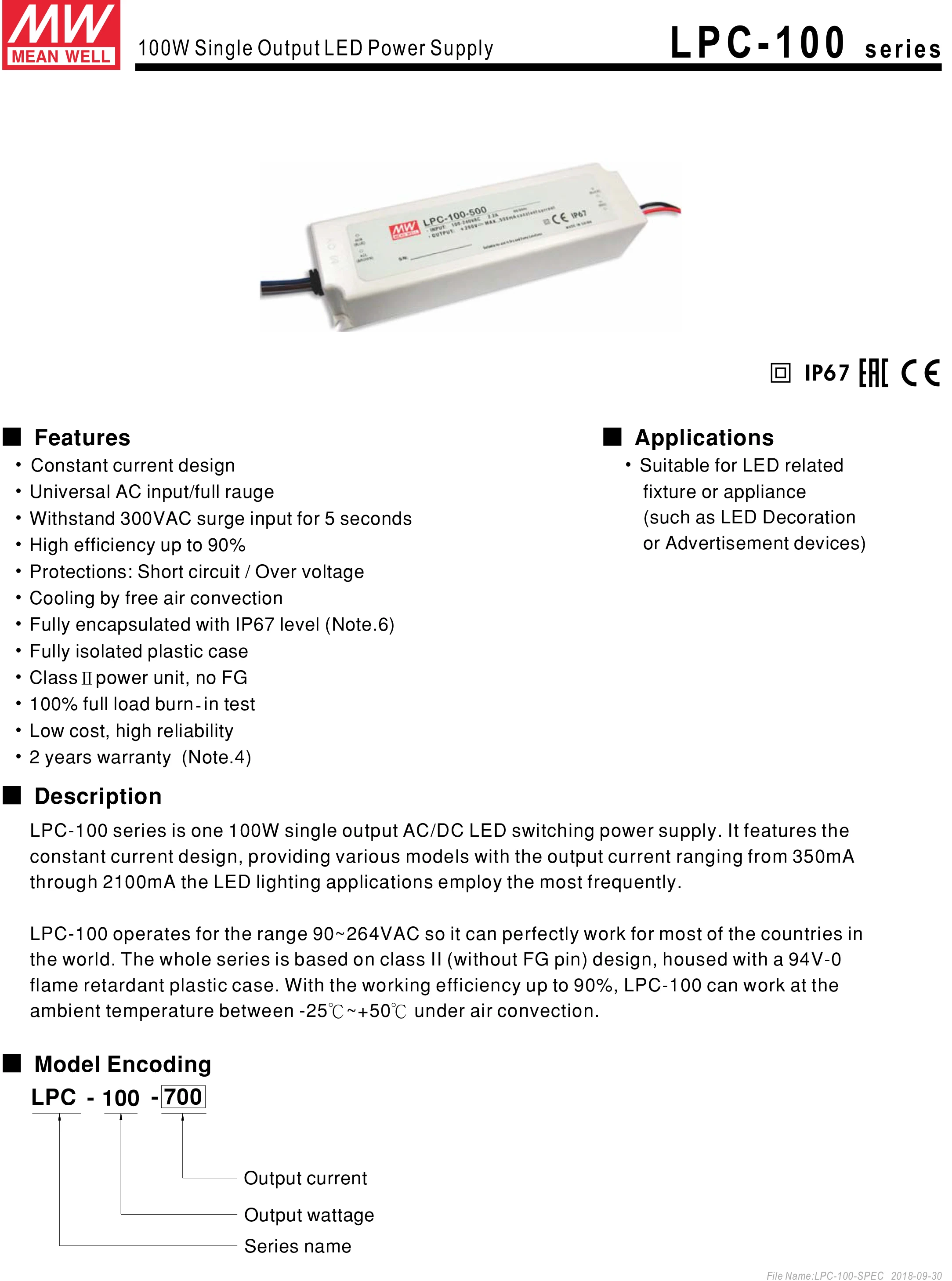 Особенности: ● Конструкция постоянного тока ● Универсальный AC inputfull rauge ● Выдерживает 300 В переменного тока импульсный вход в течение 5 секунд ● Высокая Эффективность до 90% ● Защита: короткое замыкание/перенапряжение ● Охлаждение свободной Конвекцией Воздуха ● Полностью инкапсулирован с уровнем IP67 (Note.6) ● Полностью изолированный пластиковый чехол ● Блок питания класса II, без FG ● Подходят для светодиодный освещения и передвижных элементов (Note.7) ● 100% испытание на полную нагрузку ● Низкая стоимость, высокая надежность ● Гарантия 2 года (примечание 4) ■Applications ● Подходит для L ED Приспособление или прибор (Например, L ED Decoration Или рекламные устройства) Описание LPC-1 серии 00-это один 100 Вт с одним выходом AC/DC Светодиодный импульсный источник питания. Он оснащен Конструкция с постоянным током, обеспечивающая различные модели с выходным током от 350 мА Через 2100mA светодиодный осветительный прибор используется наиболее часто. LPC-100 работает в диапазоне 90 ~ 264VAC, поэтому он может идеально работать для большинства стран в Мир. Вся серия основана на дизайне класса II (без FG pin), размещенной с 94V-0 Огнестойкий пластиковый чехол. С рабочей эффективностью до 90%, LPC-1 00 может работать на; Температура окружающей среды от-25 °C ~ + 50 °C при конвекции воздуха.