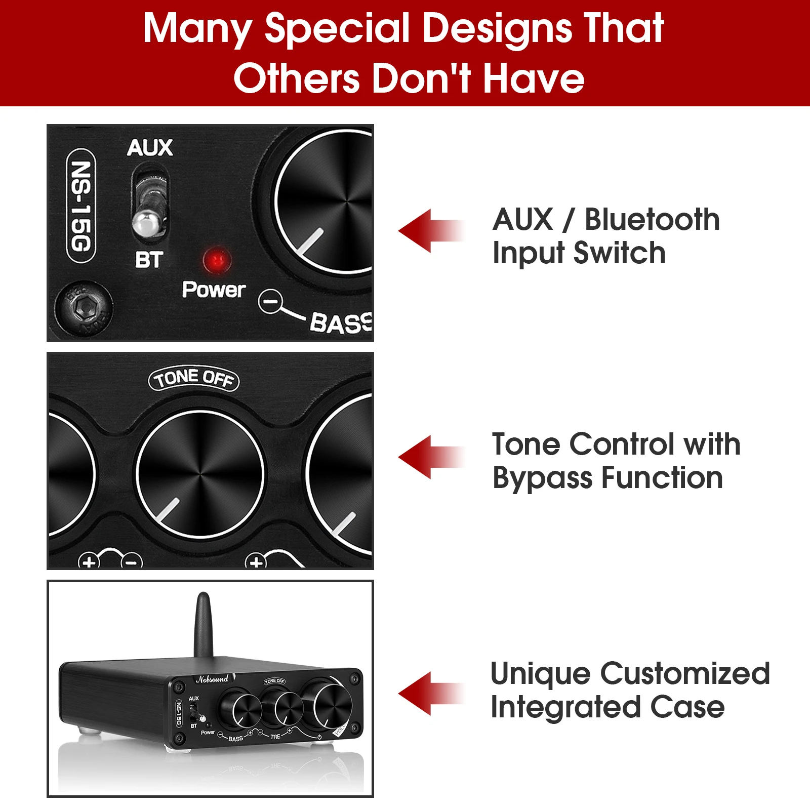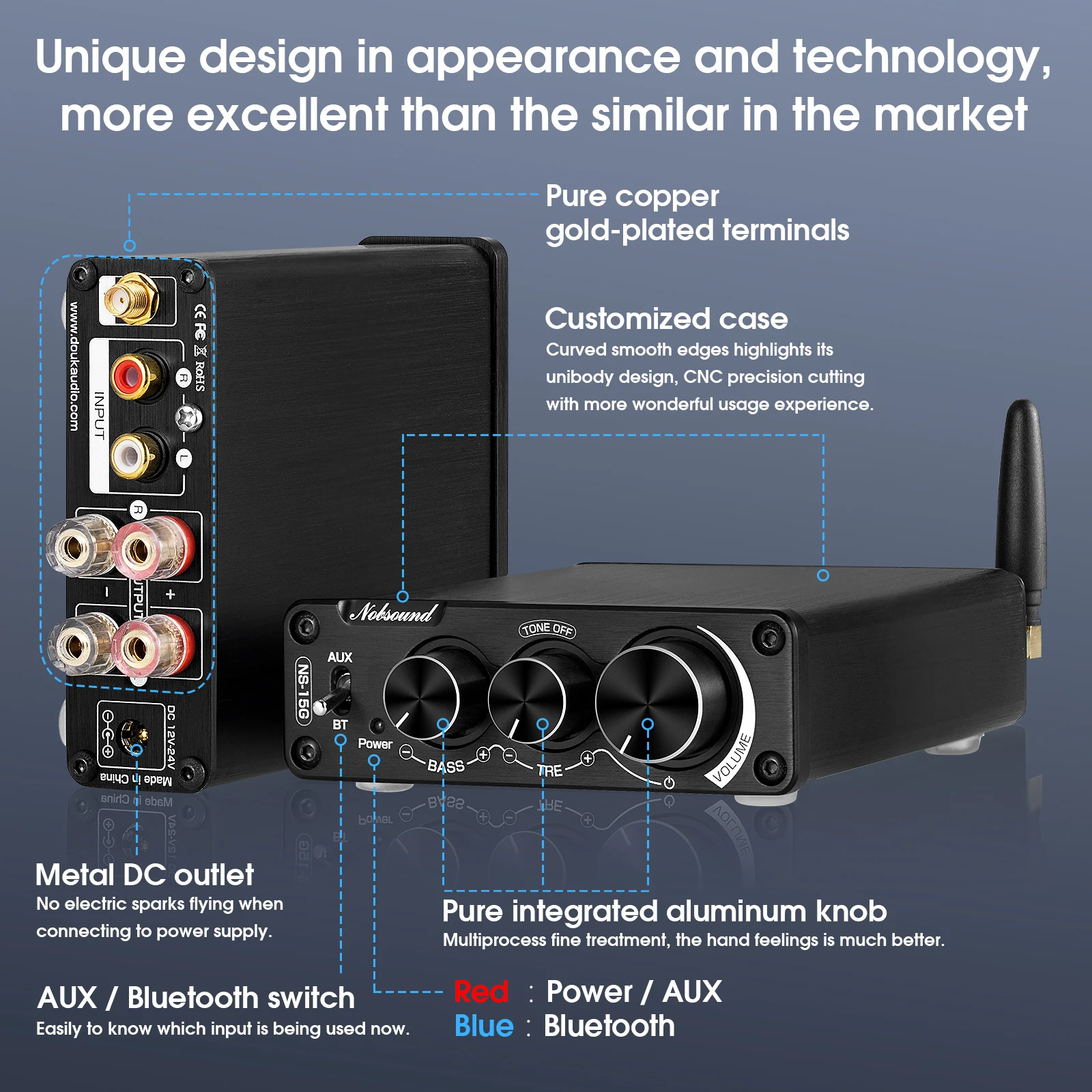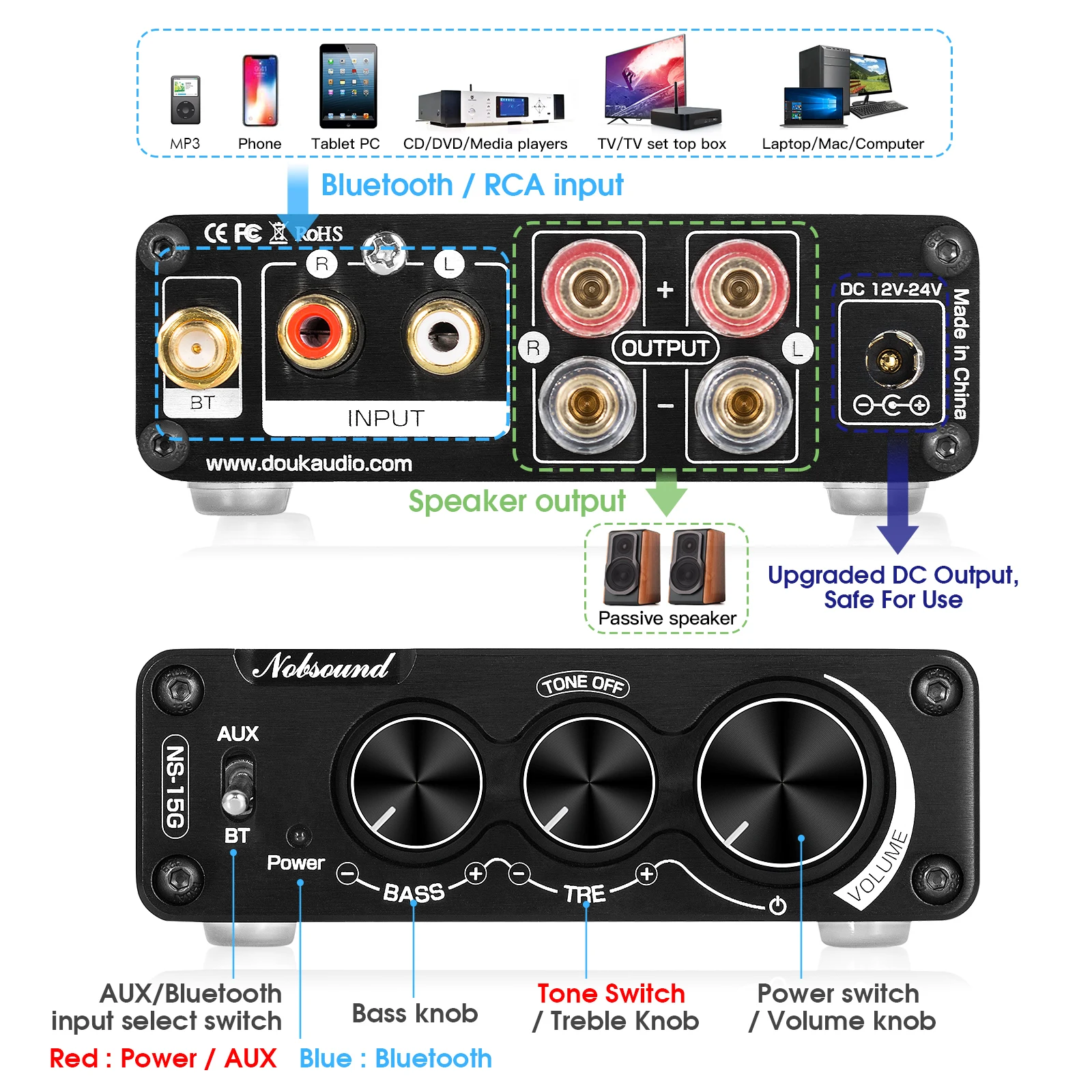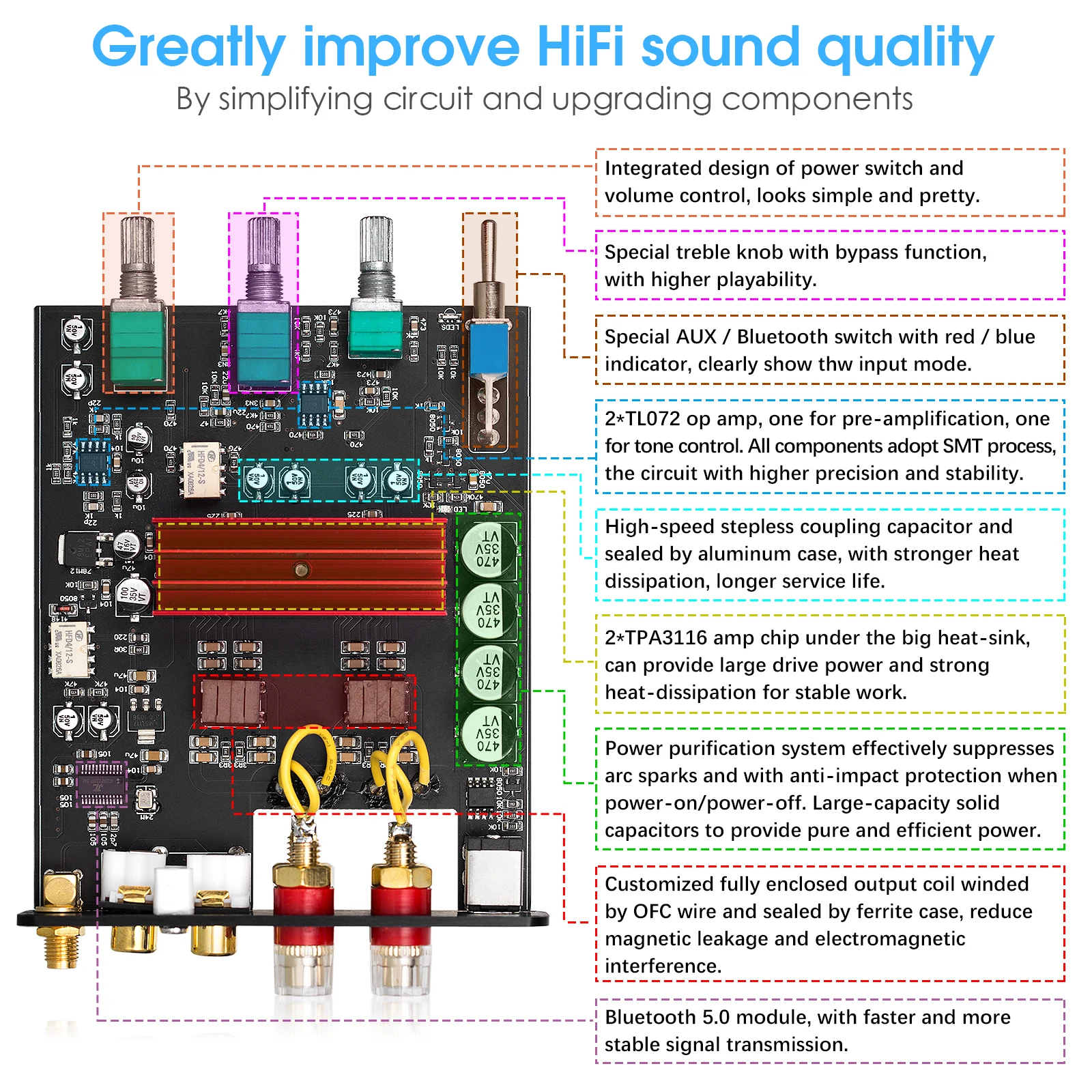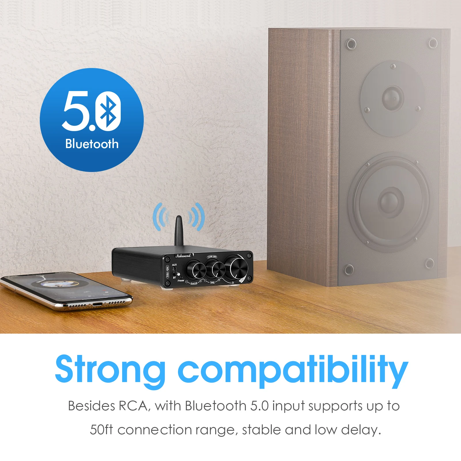 Высокая совместимость и большая выходная мощность: кроме RCA, с входом Bluetooth 5,0 поддерживает диапазон подключения до 50 футов, стабильная и низкая задержка. 2 шт. чип TPA3116, максимальная выходная мощность может достигать 200 Вт, поставляется с источником питания 19 в, может управлять динамиками 200 Вт (8Ω) или 300 Вт (4Ω).