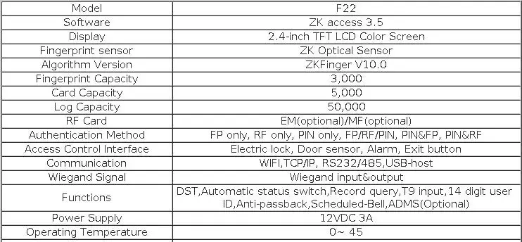 F22 обеспечивает превосходное прикосновение к сенсорной клавиатуре и обеспечивает гибкость для самостоятельной установки или с любой третьей вечерние панелью управления доступом, которая поддерживает стандартный сигнал wiegand. TCP/IP, RS485 и Wi-Fi также доступны, что устройство может использоваться в различных сетях.