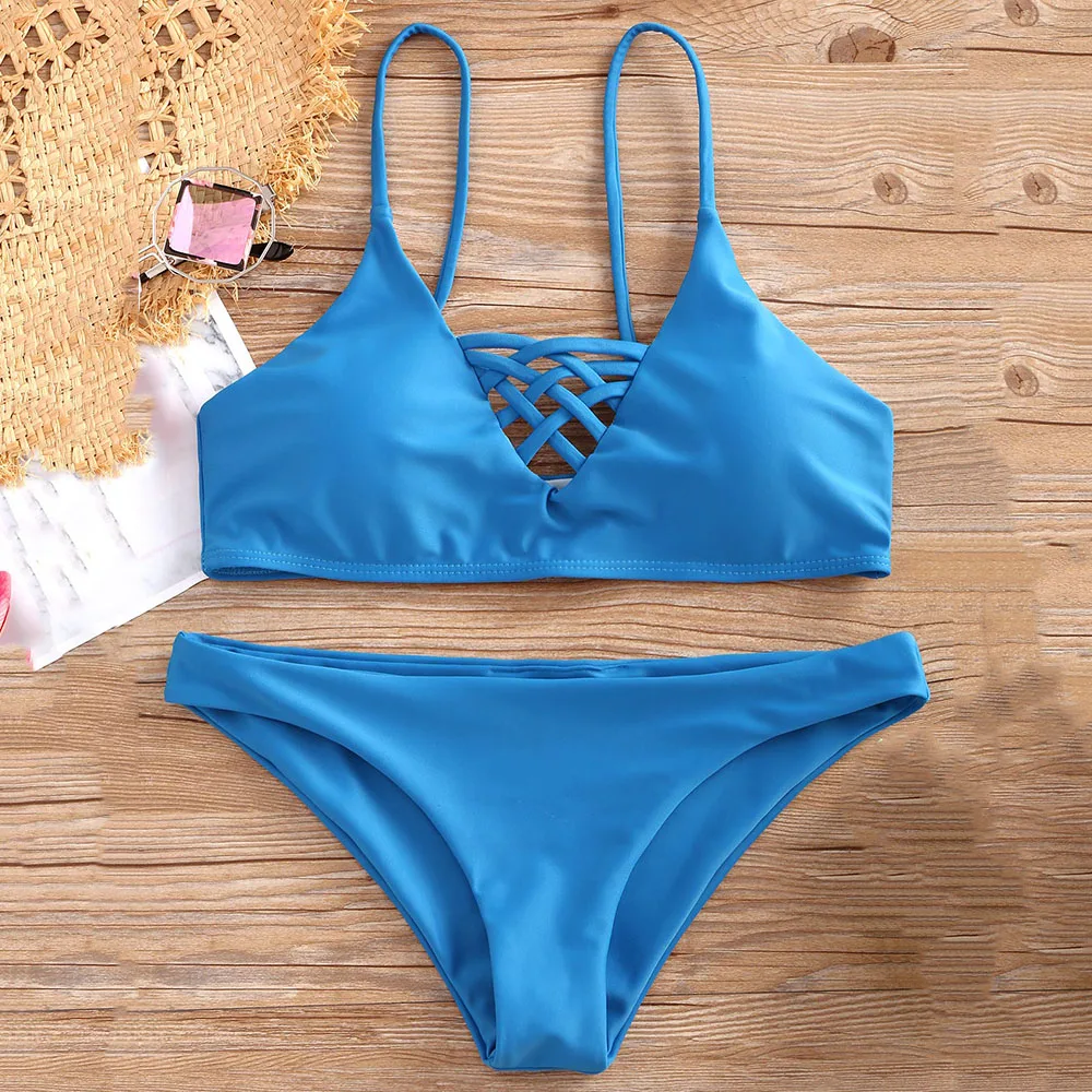 ZAFUL на шнуровке купальник Ками купальники Для женщин Sexy крест-накрест с глубоким вырезом бикини купальник с открытой спиной пляжная Купальники Бикини