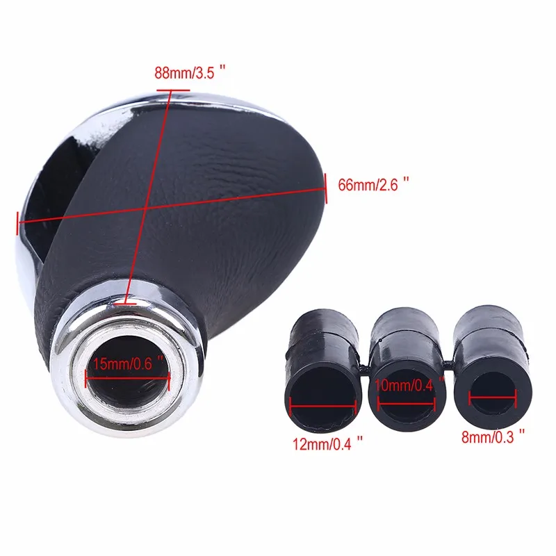 100% Новый бренд Материал: кожа + алюминий С 3 пластиковыми адаптерами (8 мм, 11 мм, 12 мм) для легкой установки Никаких изменений не требуется, непосредственно Обновите оригинальную ручку Цвет: черный Размеры: 75 мм x 52 мм/2,9 ''x 2'' (Длина x Ширина) Отверстие Диаметр: 15 мм/0,6" Применимость: Универсальный подходит для большинства автомобилей Посылка включает в себя: 1x Алюминий рукоятка рычага переключения передач 3x Пластик адаптер 4x небольших винтов 1x Шестигранный ключ Установка: 1. Снимите оригинальную ручка переключения рулевого механизма автомобиля 2. Возьмите пластиковые адаптеры подходящего размера для ручки переключения передач 3. Поместите головку шестерни в ручку переключения передач 4. Головка шестерни непосредственно устанавливается в стержень рычага переключения передач5, затяните Маленький Винт