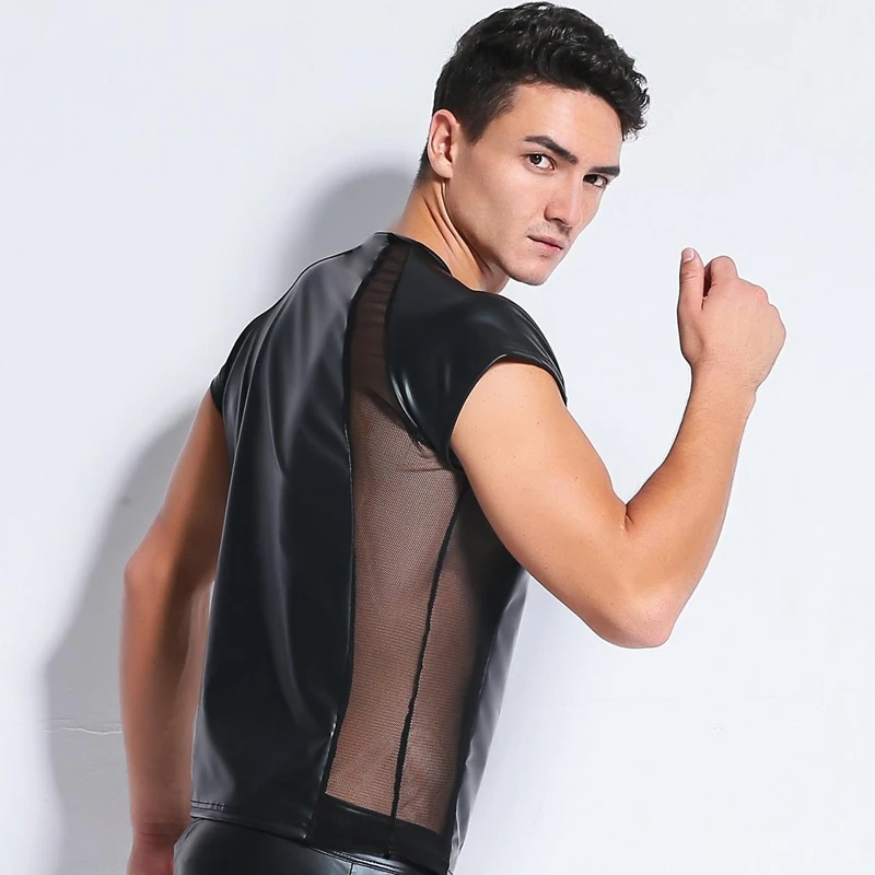 Мужские футболки, сексуальный сетчатый жилет из искусственной кожи с заклепками, нижнее белье, клубная одежда, костюм, гей нижнее белье, черный мокрый вид, фетиш, танцевальные топы, футболка