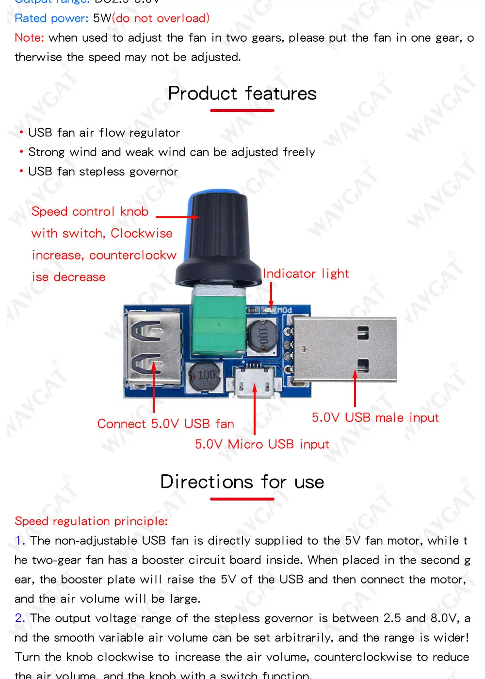 3. Диапазон электропитания:DC 4~ 12V4. Выходной диапазон:Постоянный ток2,5 ~8,0 V5. Номинальная мощность:5 Вт(Пожалуйста, не используйте перегрузку)6. Важно обратить внимание:Для двухсменного вентилятора, пожалуйста, поместите вентилятор в одну шестерню, иначе вы не сможете регулировать скорость!