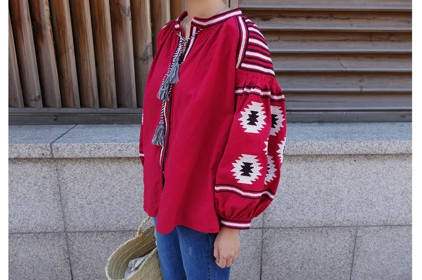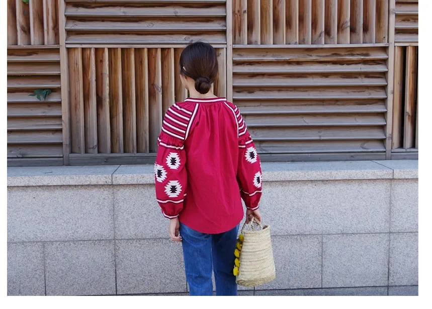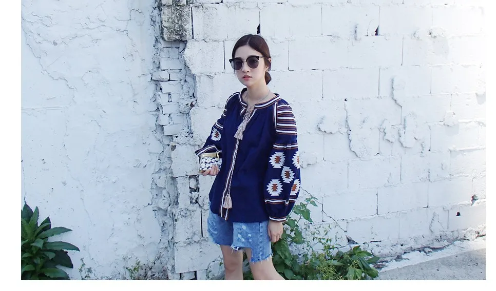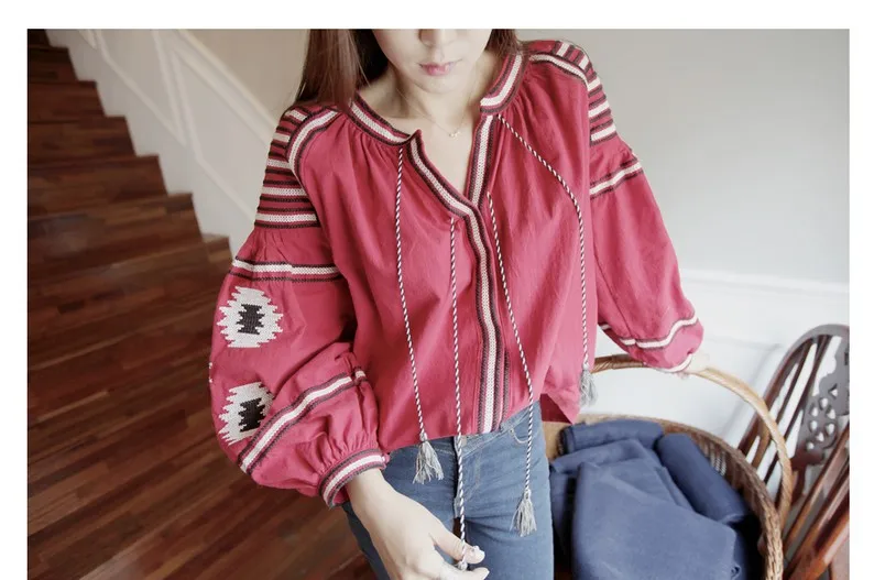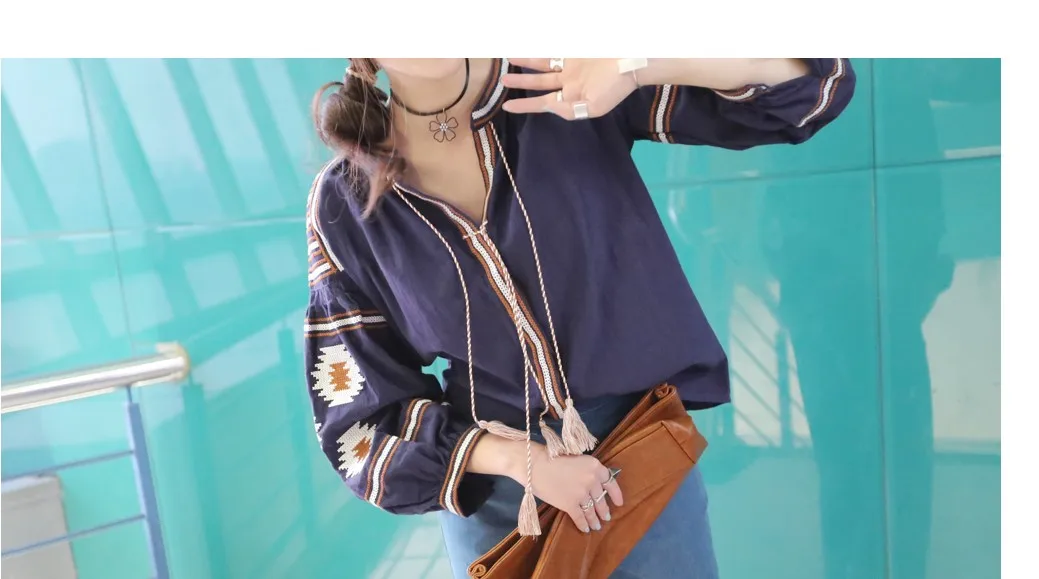 Женская рубашка в этническом Корейском стиле с рукавами-фонариками, парусиновые топы с v-образным вырезом, богемные повседневные блузки, DW435 <