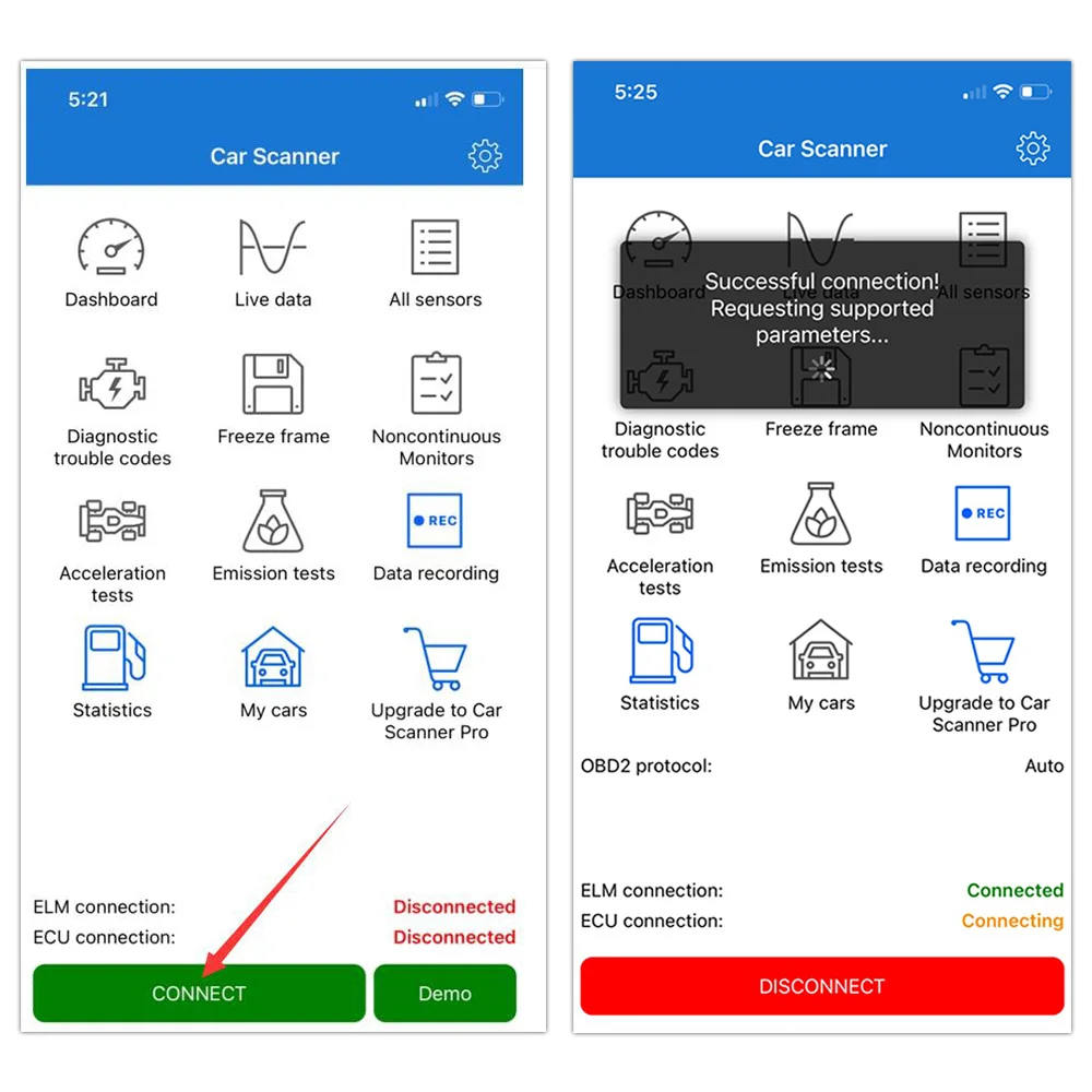 2. install OBS2 device with car, start engine, and connect OBD II wifi with android phone.