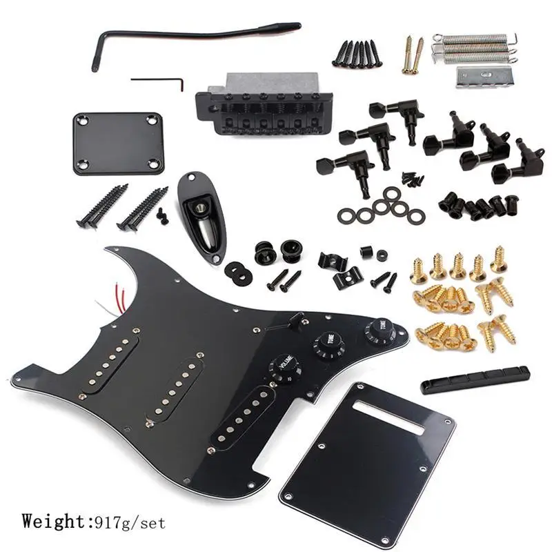 -Этот набор для электрогитары DIY включает в себя полные аксессуары, необходимые для сборки полной гитары, такие как накладка, задняя крышка, мостовая система, винты и розетки и т. Д.