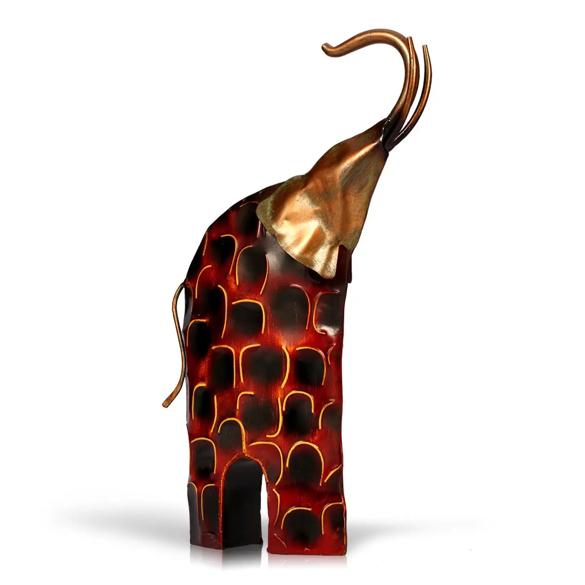 Это металлическая скульптура какого-либоПовышение головыСлона. Слон символизирует благоприятное. Изготовлено вручную с использованием различных методов литья кованого железа старым мастером. Красивый и экологически чистый цветной лак гарантирует, что он не будет ни ржаветь, ни выцветать. Слон имеет вогнутые и выпуклые полосы на своем теле. Выглядит более впечатляющим после очаровательной. Осанка с видом содержит его положительный дух. Вы можете купить его в качестве подарка для себя или своих друзей.