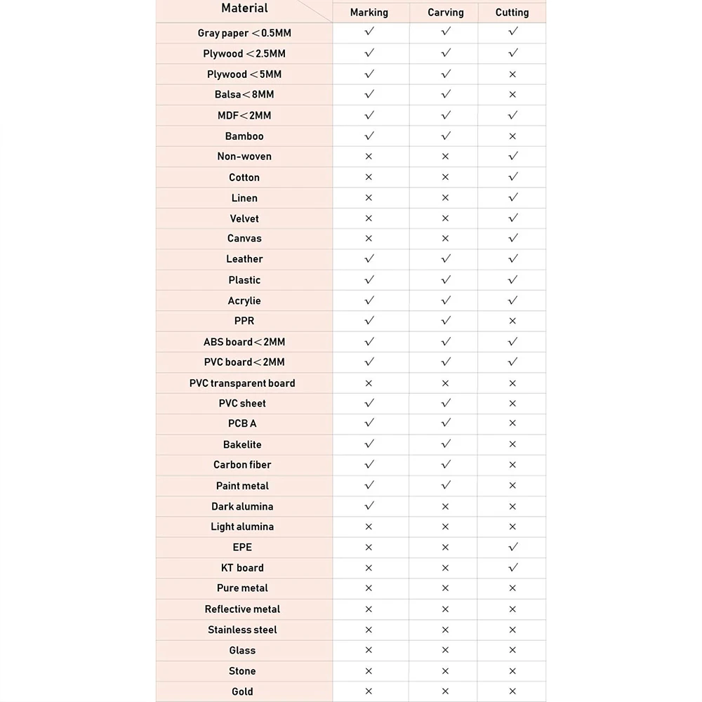 Возможна гравировка: МДФ/Бальза/бумага/дерево/ткань/пластик/кожа/Фанера/поролоновая бумага/анодированный алюминий