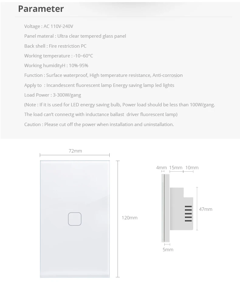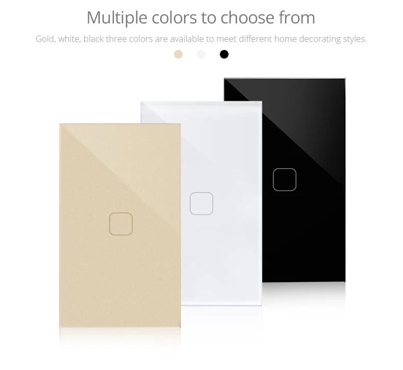 Характеристика: Упрочненная стеклянная панель, не выцветает, элегантный и стильный Интегрированный дизайн панели, водонепроницаемый и анти-ползучий, Безопасный в использовании Сенсорное управление обеспечивает более длительный срок службы, чем механический переключатель Новый импортный Процессор IC для хорошей чувствительности и стабильной производительности Гуманизированная конструкция: выключатель может автоматически отключаться при отключении электричества, и он будет находиться в отключенной станции, когда электричество вернется Используется для товарных домов, вилл, гостиниц и т. Д. Все продукты изготовлены по высоким стандартам и сертифицированы для использования в США. . Описание: Тип: сенсорный выключатель 1/2/3 Цвет корпуса: белый/черный/золотой Напряжение: 110-240 В переменного тока Мощность нагрузки: 5-300 Вт/комплект Сертификация: CE, FCC, RoHS Рабочая температура:-20-70 градусов Материал: Одинарная кристальная панель из закаленного стекла Применение: лампы накаливания, люминесцентные лампы, энергосберегающие лампы, светодиодные лампы В комплект входит: 1 х сенсорный переключатель 2 x винт 1 x Руководство пользователя