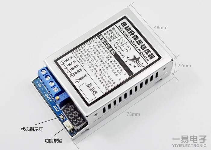 Reminder, the picture was originally taken. Now the label sticker, the input voltage is DC4.5-30V. Module parameters: Input voltage: DC 4.5~30V Please do not reverse the positive or negative, or will damage. Output voltage: DC 0.5~33V Maximum output current: 5A Maximum output power: 80W For a long time, please strengthen the heat dissipation. Conversion efficiency: 91% (12V input, 19V output 2A measured). Module size: 78*48*22mm (long wide and thick) Be careful:This module is a voltage regulator module, without constant current function, can not output directly connected to the battery or LED (that is, the output can not be directly connected to the battery, such as with the battery itself with charging circuit can be accepted, such as charging treasure, LED itself with the drive is no problem,). Module use must comply with the power and voltage parameters, and must follow the law of conservation of energy, otherwise it can not be used, will be vulnerable to bad, it is recommended to determine a good use of the environment, in the decision to buy, thank you!