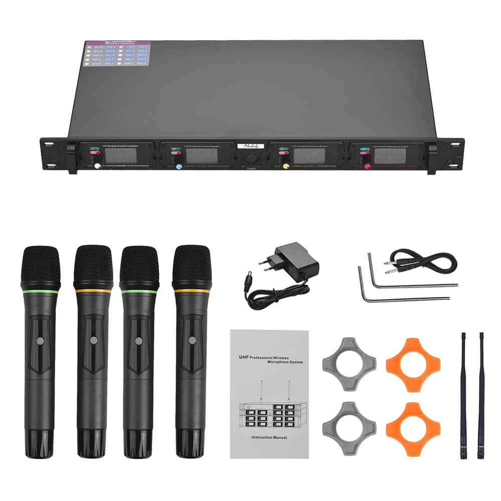 Эта беспроводная микрофонная система включает в себя 4 портативных микрофона + 1 монтируемый в стойку приемник, подходит для публичной речи, обучения в классе, деловых встреч, караоке и т. д.