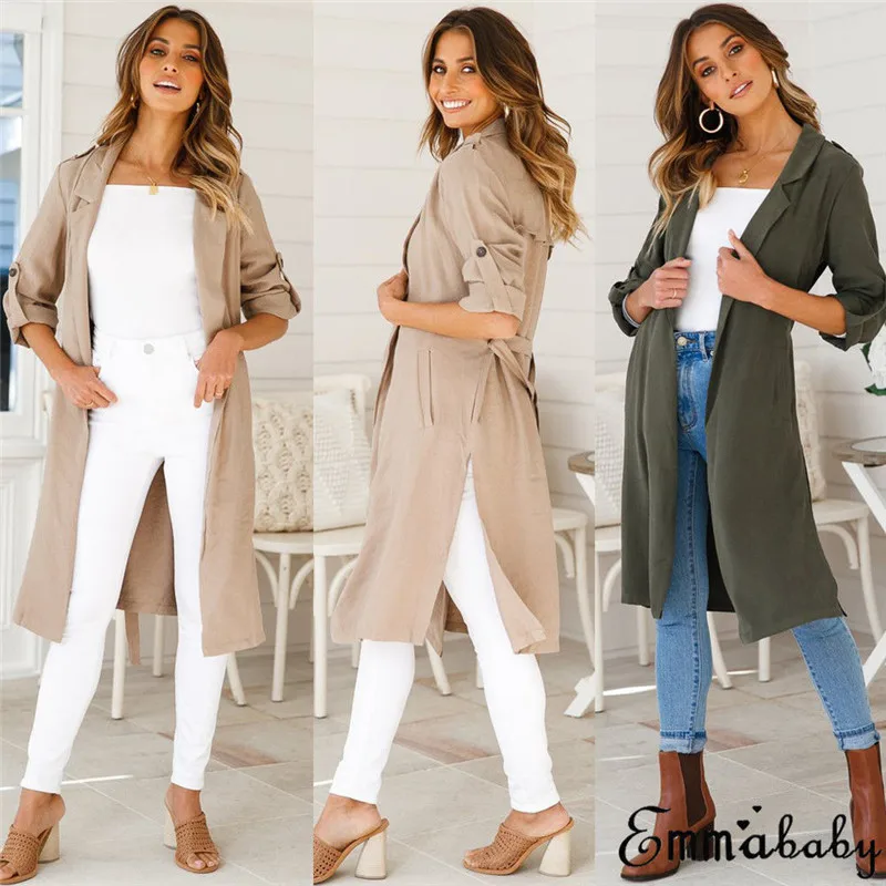 2018 модное женское пальто с длинным рукавом свободное открытое переднее ДРАПИРОВАННОЕ пальто с карманами Тренч средней длины Осенняя повседневная классическая верхняя одежда