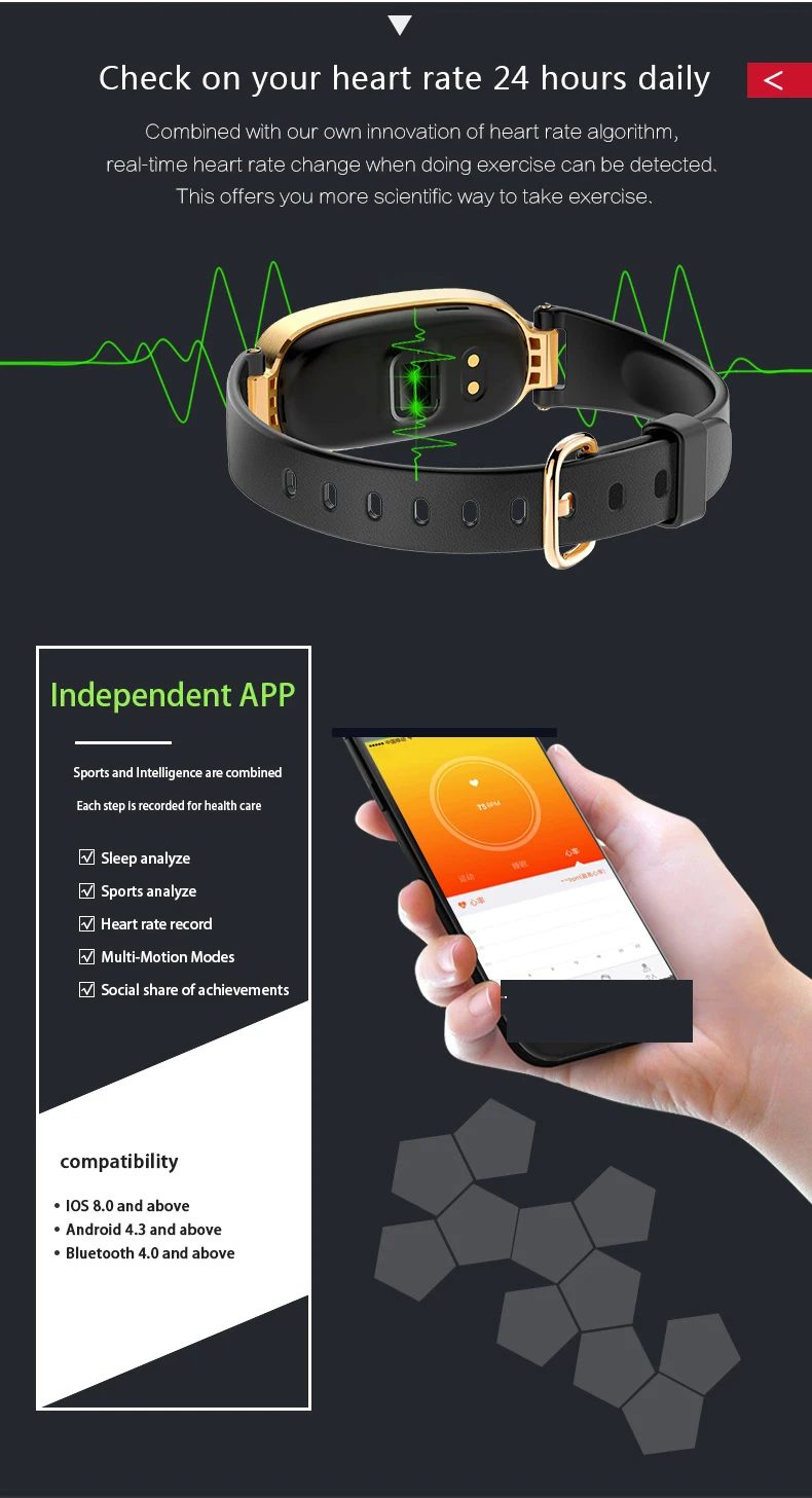 * Функция оповещения и уведомления: Напоминание о звонках (Android, IOS), Отображение имени котакта/SMS, QQ, WeChat (Android, IOS), отображение содержимого/Facebook, Twitter, Line,SKYPE, WhatsApp, Kakaotalk, Instagram, Snapchat/Сигнализация/Напоминание о сидячем положении