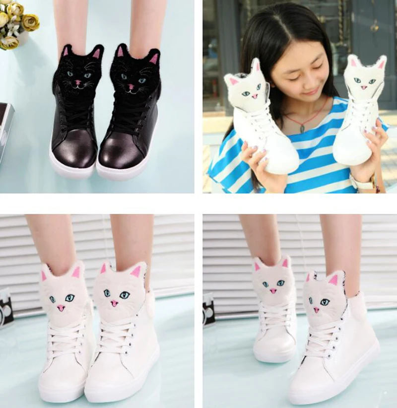 Женские ботинки из искусственной кожи, зимние ботинки на шнуровке с мультяшным котом, ботинки на платформе, 2019