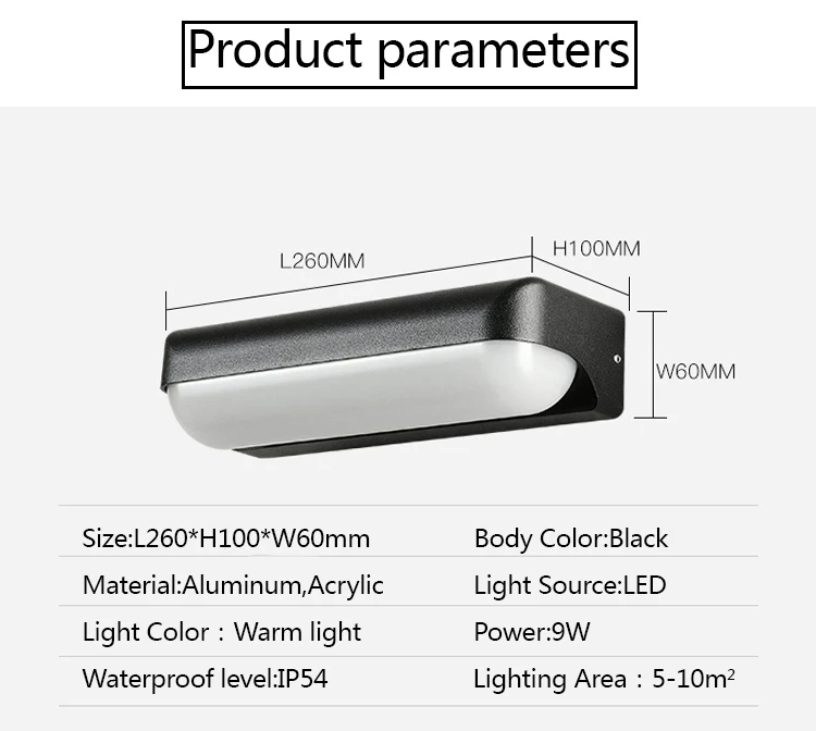 1. Мощность: 9 Вт 2. Напряжение: AC85-265V 3. Источник: светодиодный светильник 4. Срок службы: 30000-50000hours 5. Материал: алюминий 6 Водонепроницаемый: IP54 Применение: Сады, коридоры, дворы, виллы и т. Д.