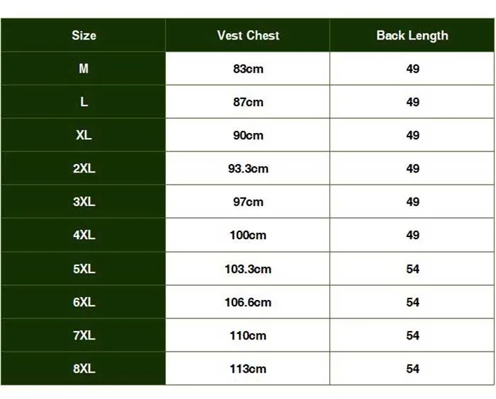47,5 кг, размер-М 50 кг, размер-L 55 кг, размер-XL 60 кг, размер-2XL 62,5 кг, размер-3XL 65 кг, размер-4XL 67,5 кг, размер-5XL 70 кг, размер-6XL 73 кг, размер-7XL 77,5 кг, размер-8XL