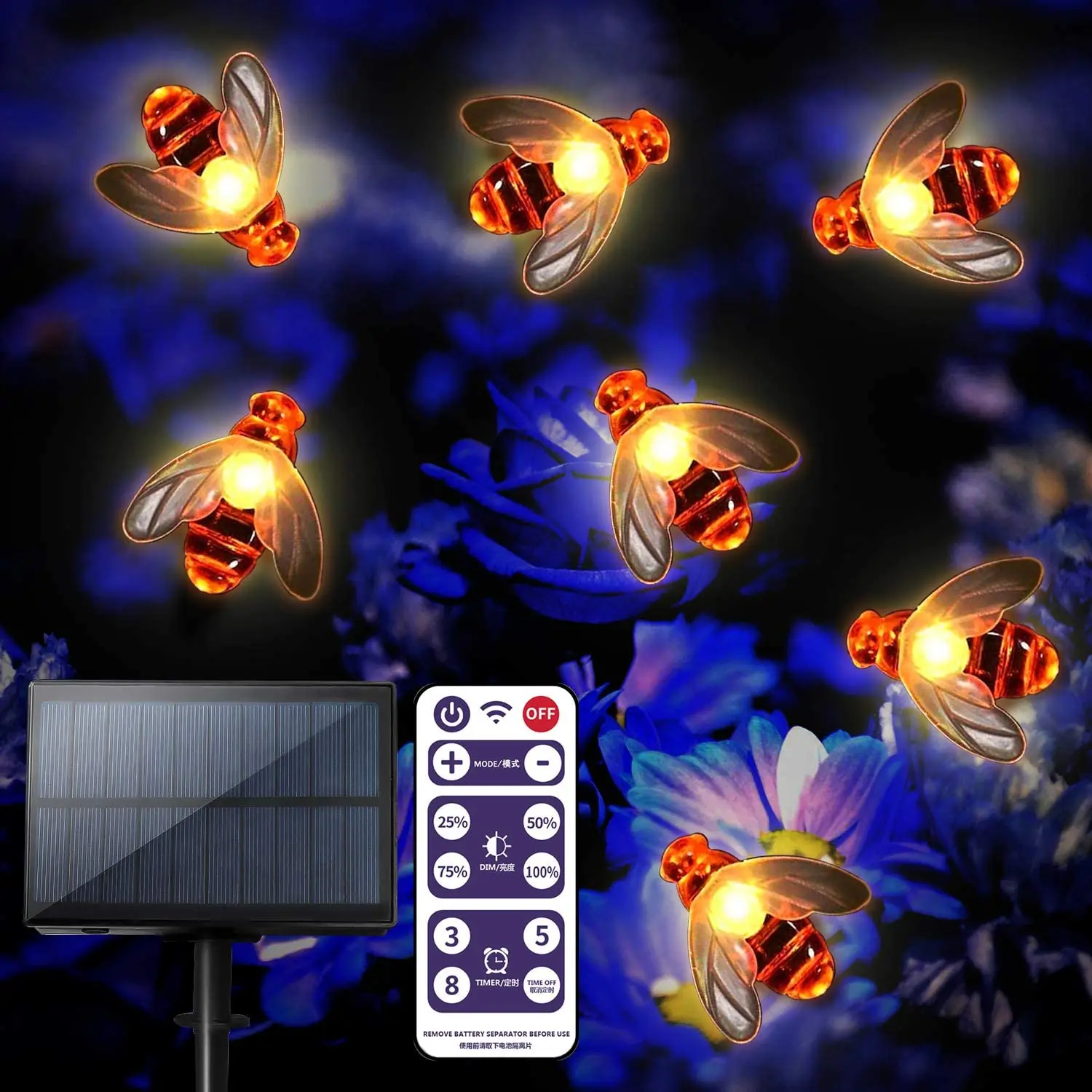Уличное Использование: эти огни водонепроницаемые, оставляйте эти огни на дисплее круглый год, расслабьтесь и наслаждайтесь вечерним отдыхом. Простая установка и энергосбережение-работа в течение пяти часов, а затем автоматическое преобразование до 30% яркости (ежедневный цикл или после сброса) Размер пчелы 3.8CMX3.8CM