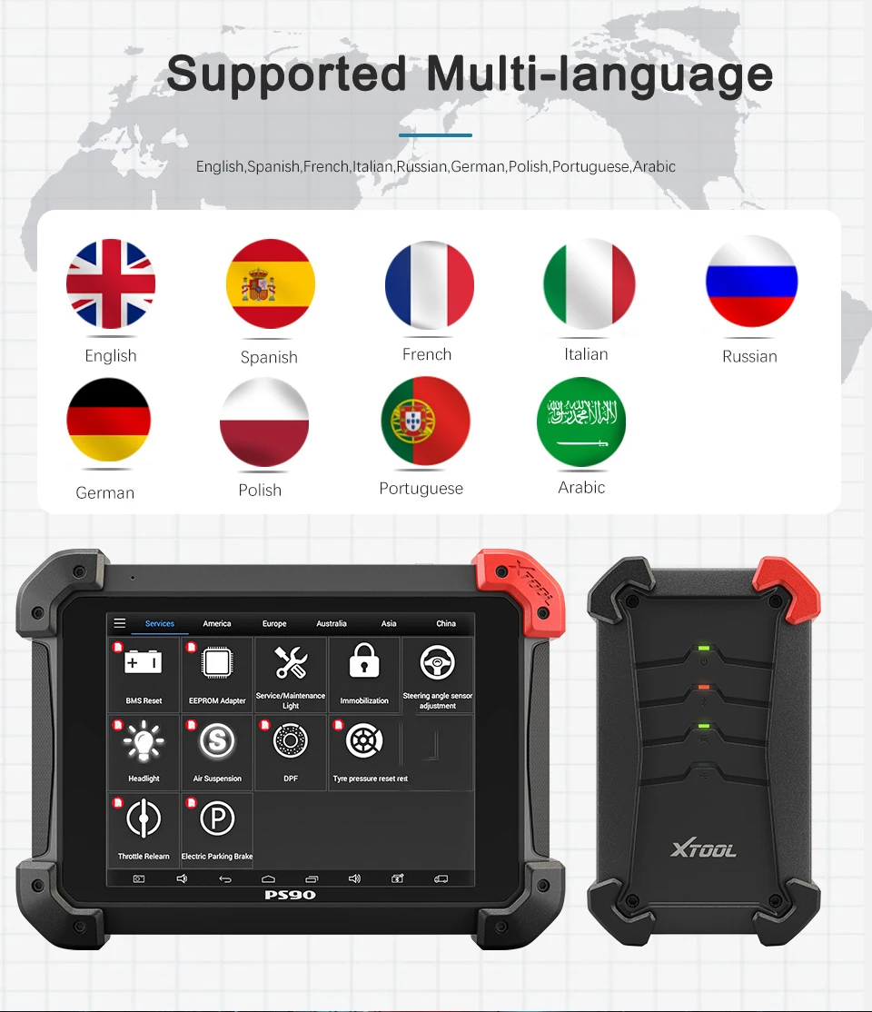 И сделать более быструю диагностику и техническое обслуживание с помощью кодов чтения/очистки, а также просмотр данных в реальном времени и т. Д., но стоит всего несколько минут, чтобы закончить полное сканирование. Вы можете научиться выполнять сложные диагностические функции, которые дадут вам гораздо больше энергии над ins и выходами вашего автомобиля, чтобы понять, что происходит с вашим современным компьютеризированным автомобилем, чтобы вы могли его зафиксировать и вернуться в дорогу вовремя. Краткое введение его возможностей в полных системах диагностики следующим образом:1. Для системы двигателя: диагностический инструмент XTOOL PS90 может помочь в обнаружении зажигания двигателя, впрыска топлива, соотношения воздуха и топлива и условий выбросов выхлопных газов в системе двигателя для повышения производительности транспортного средства, экономит энергию и уменьшает выброс выхлопных газов.Китайский, английский, арабский, немецкий, русский, японский. Корея, Италия, Франция, Польша, Турция, испанский, португальский, тайский язык
