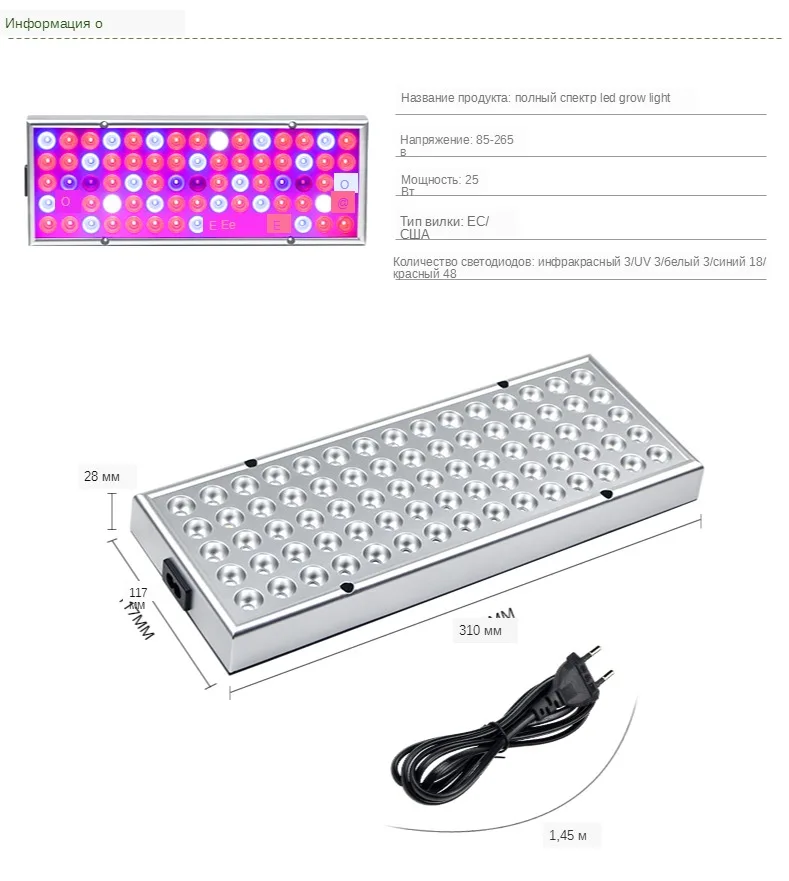 1. Мощность: 25 Вт 2. СВЕТОДИОДНЫЕ Чипы: 47красный + 19 синий + 3UV + 3IR + 3 белый 3. Срок службы: 30 000 часов 4. Материал: АБС-пластик 5. Входное напряжение: 85-265 в 6. Частота: 50/60 Гц