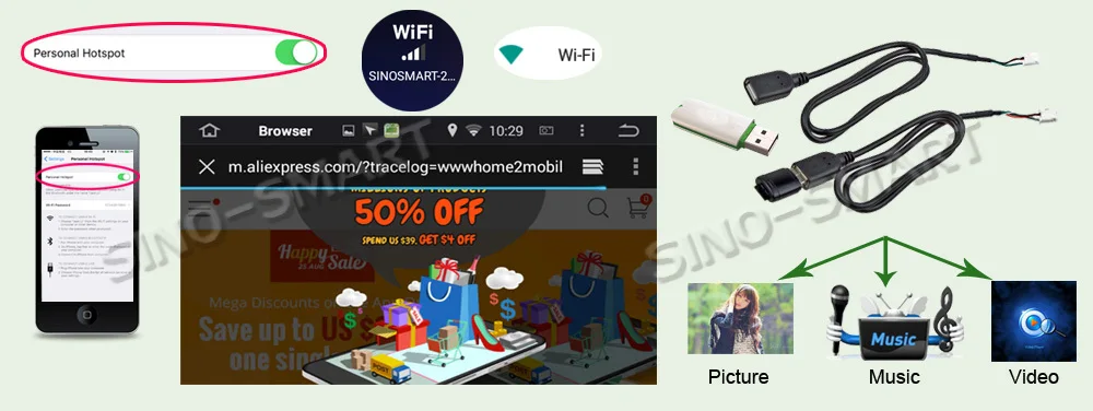 6. Встроенный WIFI (посетите Интернет через телефон hotpot) 7. Музыкальный и видео плеер (воспроизведение музыки или видео онлайн, с USB диска или встроенной памяти)