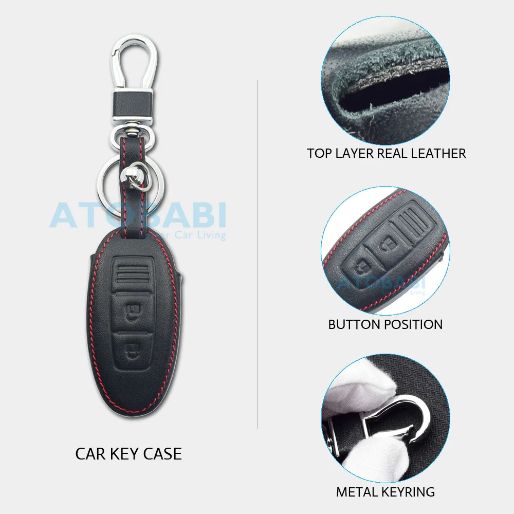 Характеристики и характеристики: 1. Бренд: ATOBABI 2. Материал: первый слой из натуральной кожи. 3. Кнопки: 2 4. Отличное соответствие размеру ключа и точному положению кнопки. 5. Защитите ваши автомобильные ключи от повреждений, следов, пыли и царапин. 6. Не влияет на сигнал автомобильного ключа. Совместимость с моделями: Для Nissan 350Z Almera Altima Armada Qashqai Cefiro Cube Juke Livina (Примечание: Совместимость только для справки, пожалуйста, сравните изображение с ключом автомобиля перед покупкой.) Посылка включает: Чехол для автомобильного ключа-1 шт. 1 х кольцо для ключей (Автомобильный ключ в комплект не входит.)
