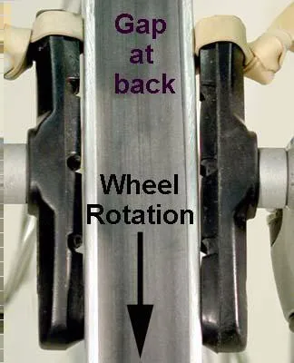 Для торможения, который нужно наносить, прокладка под углом, поэтому передняя кромка колодки ударяет в первый раз. Это уменьшает наклонность рычага сгибать вперед и назад, создает гармонический резонанс, который пищает во время некоторого торможения.