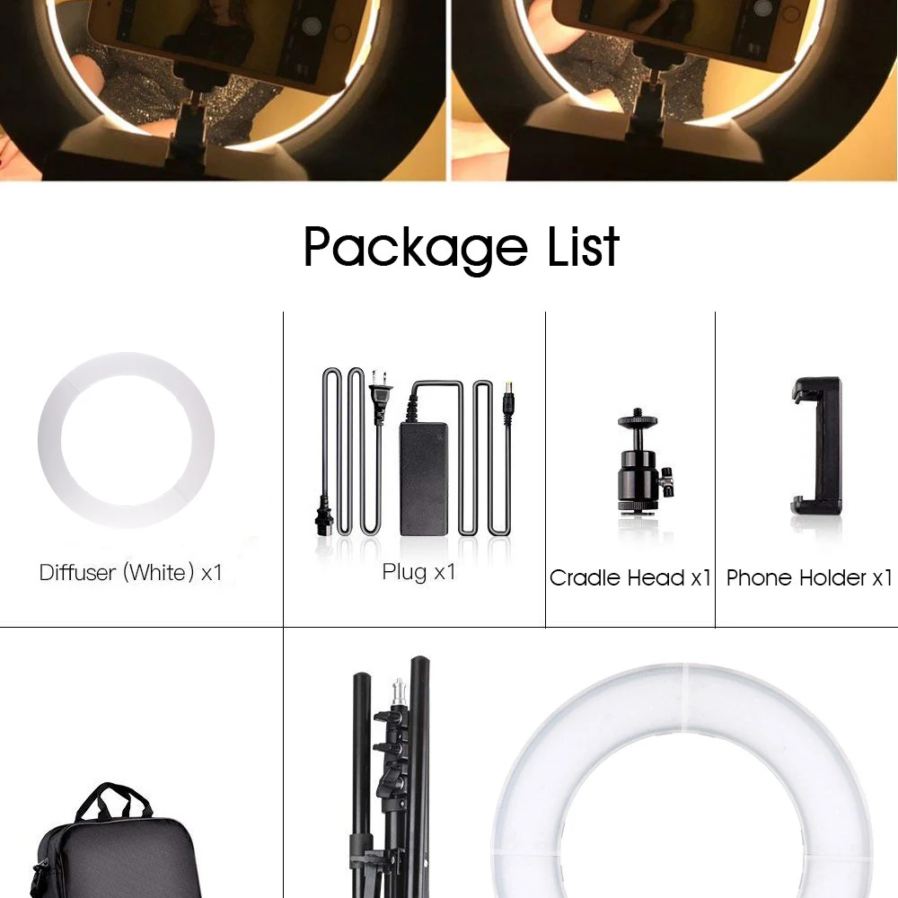 Двухцветные 3200K-5500K:Цветовая температура неограниченная, регулируемая. Кольцевой светильник для камеры может смягчить светильник, сделав фотосъемку более естественной;