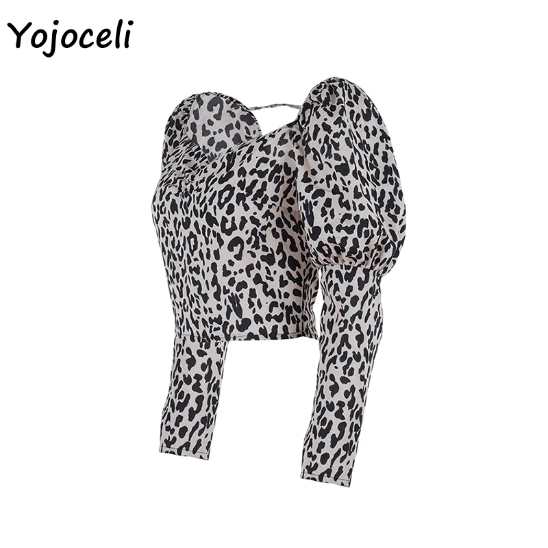 Yojocel 2018 trendy leopard blouses shirt women long sleeve square neck cropped tops streetwear puff sleeve female blusas