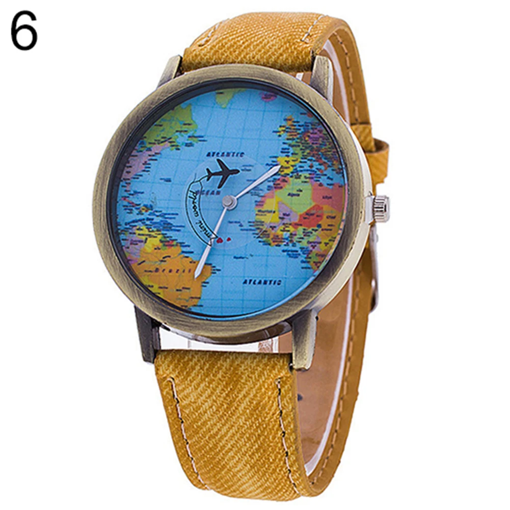 Украшенный карта мира циферблат, джинсовой ткани ремешок и нержавеющая сталь чехол.