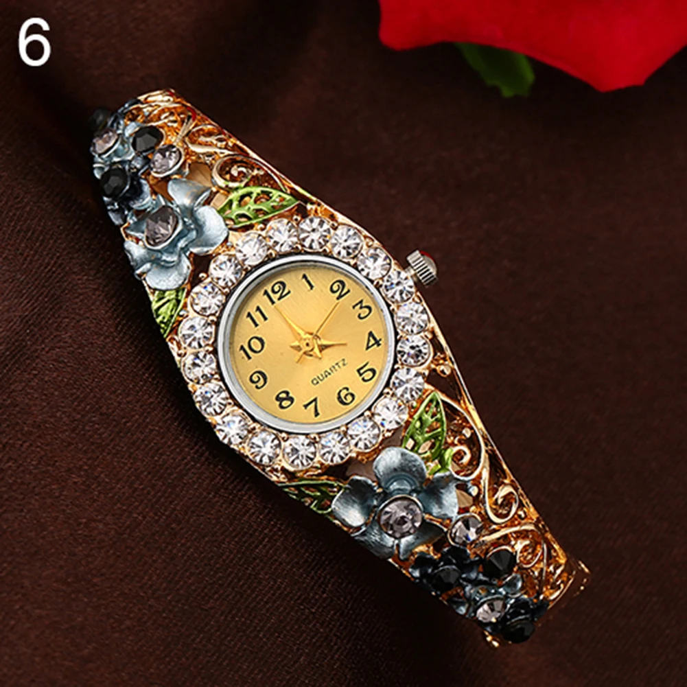 Винтажные женские часы, женские часы с кристаллами, цветной жесткий браслет с цветком, аналоговые кварцевые часы с ажурным бриллиантом, часы reloj mujer