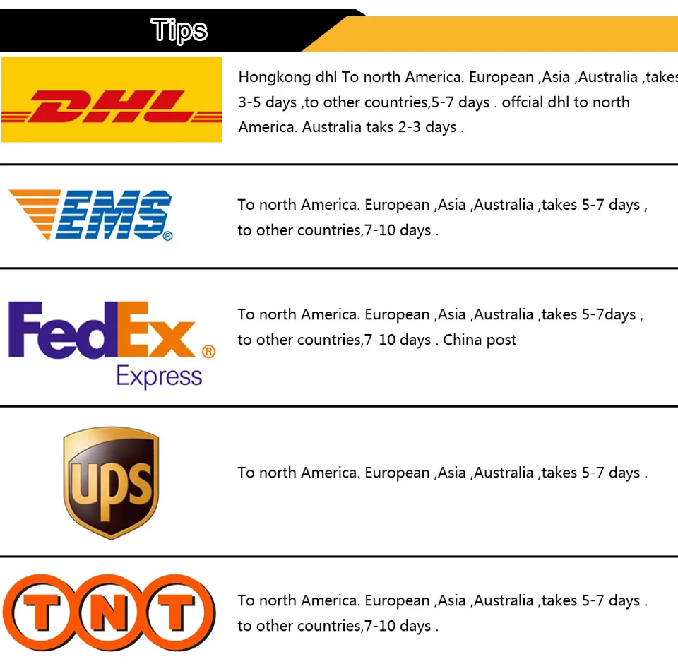 1. В: сколько дней я могу получить товар после оплаты? О: Обычно мы отправляем товары в течение 3-5 дней. И затем отправим его через DHL или другой заказ, DHL будет около 4-5 рабочих дней. Таким образом, вы можете получить товар в течение 7-10 рабочих дней. 2. Вопрос: Каковы Ваши условия оплаты? О: Мы принимаем торговые гарантии, Paypal, T/T (банковский перевод), Western Union и другие способы оплаты. 3. В: Можете ли вы поставить более низкую сумму для таможенной накладной, тогда мы можем оплатить более низкую таможенную пошлину? О: Да, мы можем сделать низкую декларировку в соответствии с вашим требованием, чтобы помочь вам избежать или оплатить меньше таможенной пошлины.