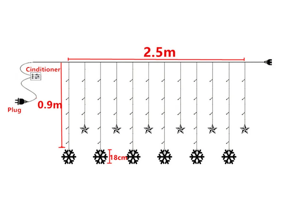 Рабочее напряжение: AC110V или AC220V Тип: Подключите Светильник для занавески мощность: 6 Вт Размеры: 2,5 м Горизонтальная Длина + 2 м Длина сетевого шнура Длина свисания Длина: 0,7-1M Количество СВЕТОДИОДНЫЙ: 138 шт. светодиодный s (включая 6 шт. звезд + 6 шт. снежинки) Светильник режим: 8 режимов Посылка включает в себя: 1 светодиодный занавес