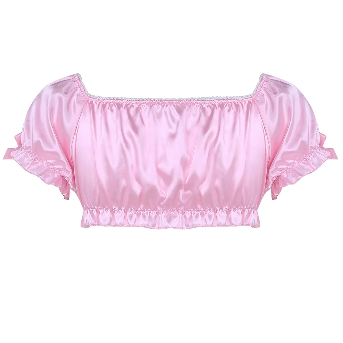 V-образная горловина, укороченный топ с короткими рукавами украшен прошитыми бантиками, эластичным гофрированным нижним бюстом.