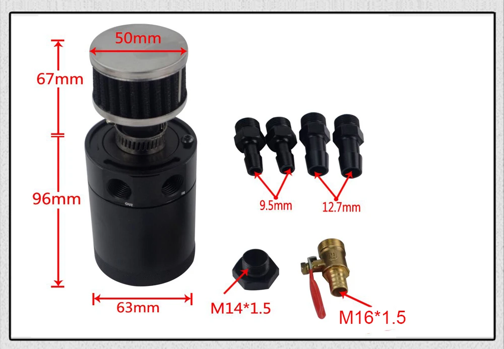 Маслоуловитель Can Breather Tank Black Breather filter Регулируемый Монтажный кронштейн Petcock Drainer левый боковой порт вход правый боковой порт выход в комплекте шлангов: 9,5 мм и 12,7 мм штепсельный адаптер включены, если Дыхательный Фильтр не нужен. Заготовка алюминиевая универсальная маслоуловитель БАК с дыхательным фильтром 200 мл сборка с фильтром из нержавеющей стали внутри для лучшей производительности.Лучшая ловушка и идеально подходит для небольших пространств этот маслоуловитель может построить с нержавеющим фильтром внутри этого маслоуловителя может собрать масло и влагу, дующих газов от PCV клапана или двигателя клапана крышки портов, идущих К всасывающей системе, которая вызывает накопление углерода и осадка в впускной системе и двигателе.Благодаря этому маслу вы можете держать ваш двигатель чистым в жестких условиях вождения, позволяя «чистому» газам быть переданным обратно в потребление.Размеры и материал: