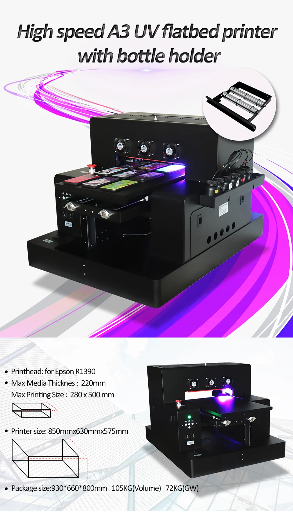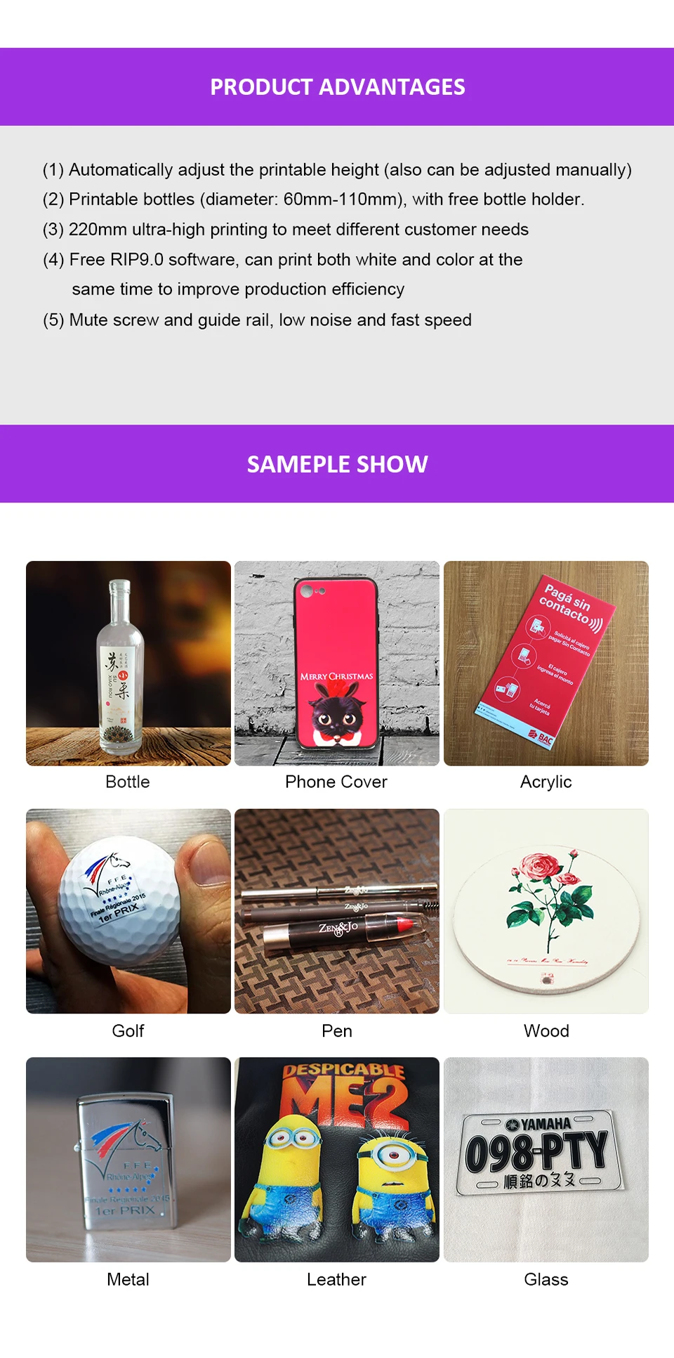 Новый автоматический УФ-принтер A3 280*500 мм размер для чехол для телефона цилиндрическая ручка головка для печати держатель для бутылки принтер с CE с RIP 9,0 Название принтера; A2850 UV принтер Преимущества: 1. Бесплатное программное обеспечение RIP9.0, может одновременно печатать белый и цвет для повышения эффективности производства 2. Держатель бутылки бесплатно, может печатать на плоской и цилиндрической поверхности. Максимальная высота для бутылки 150 мм. 3. Система водяного и воздушного охлаждения 4. Печать без пластины, не требует предварительного покрытия, экономит больше времени и затрат 5. Выходное изображение является водонепроницаемым, УФ-защитой, защитой от царапин. Изображение может сохранять более двух лет 6. Автоматическая регулировка высоты! Максимальная высота печати составляет 220 мм, выше, чем другая машина 7. Нет необходимости в прессформе или переводной бумаге, различные материалы включают ТПУ, ПК, акрил, кристалл, кожа, пластик, умственный, алюминиевый лист, ПВХ, ABS, камень, KT доска, деревянная доска, пенная доска, CD, свежий цветок; Большинство из этих типов может напечатать также цилиндрическую бутылку. 8. Плоская поверхность может печатать, даже в пределах 3 мм кривая поверхность доступна включает чехол для телефона, пластиковые карты, прозрачные визитные карточки, кожаные сумки, керамическую плитку, органическое стекло, серебро, золото, кристалл, акрил, бамбук, Органическая доска, кожа и т. Д. Спецификация: Метод печати: Бесконтактная струйная печать, микро пьезо печатающая головка, СНПЧ Конфигурация сопла: 540 штук сопла (90 шт. * 6 цветов) Минимальное количество капель 1,5 Пико литра (с интеллигентая (ый) капли технологии преобразования) Цвет: C M Y K + W Скорость: Фото A4size (Режим фото 111 секунд) Расстояние печати: 1 мм ~ 3 мм (1 мм оптимальный) Размер печати: 279*500 мм Высота Печати 220 мм Бутылка для печати1. Программное обеспечение RIP * 1 комплект 2. СНПЧ * 1 комплект 3.UV демпфер * 2 шт.