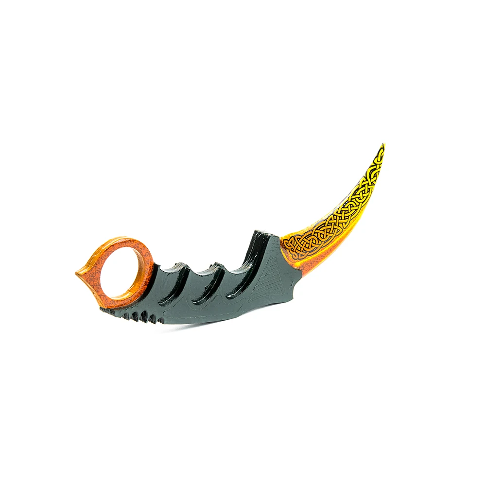 Эксклюзивный атрибут для фанатов CS-GO Какому современному ребенку не известна знаменитая компьютерная игра Counter-Strike? Пожалуй, каждый с ней знаком! На миссиях в ближнем бою игроки используют ножи, среди которых особое место занимает нож-керамбит. Предлагаем Вам игрушечную копию керамбита из «Контры», выполненную из дерева. Преимущество материалов в их долговечности и безопасности, чего не скажешь о пластиковых аналогах. Оригинальный и стильный дизайн ножа – то, что привлекает внимание: на лезвие нанесен рисунок орнамента – вязи, так же, как и на крепёжном кольце. А рукоятка с выемками для пальцев удобно ложится в руку. Пополните коллекцию игрушечного оружия