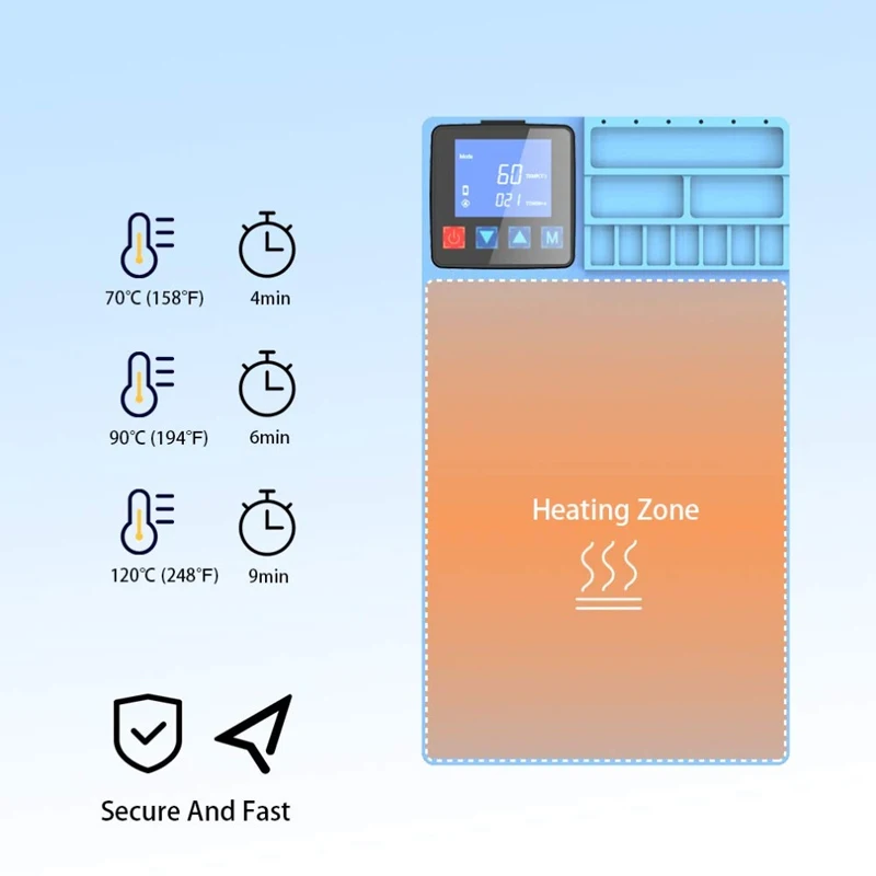 Поддержка для 110V/220V Дизайн и добавление канавок для небольших аксессуаров в новый продукт. Настройка Температуры 60 градусов. Поместите мобильный телефон на экран для демонтажа (ЖК-дисплей с лицевой стороны). Подогрев в течение 5-10 минут. Тестирование размягчения Мобильный телефон LCD боковой клей с инструментом для удаления экрана. Определите, что размягчение может быть разобрано.