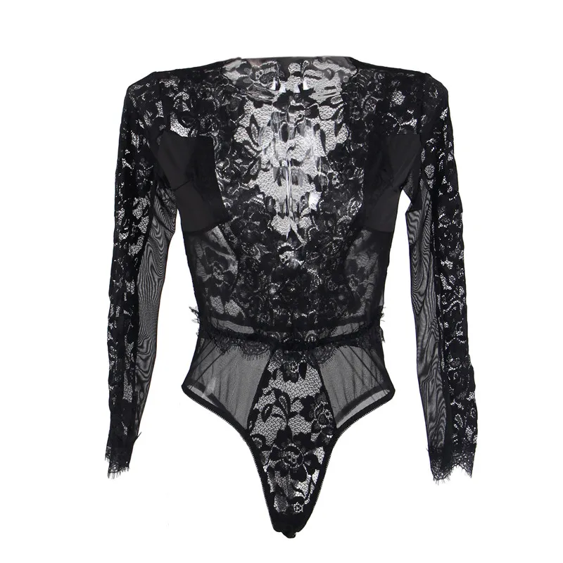 Женский вечерний комбинезон с длинным рукавом Comeondear, черный, красный комбинезон с кружевным цветочным рисунком, сексуальное Сетчатое боди с глубоким v-образным вырезом RA80588, Описание: